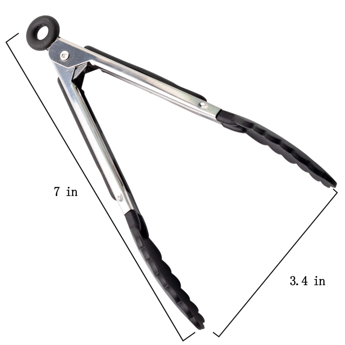Winning team 7 Pack Kitchen Tongs Set 7-Inch Black Mini Small Food Tongs with Stainless Steel Silicon Handles and Nylon Tips Heat Resistant Tongs for Cooking Serving BBQ Grilling Salad and More