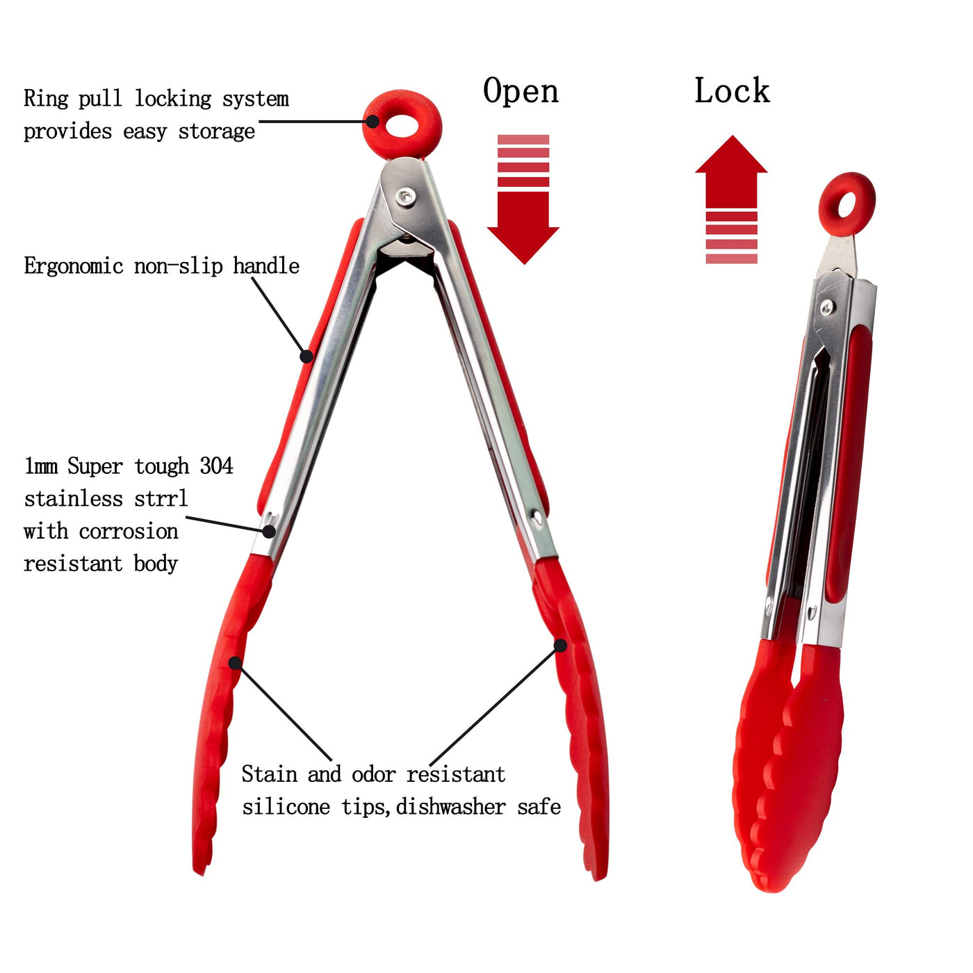 - Q: How can I store the tongs when not in use? A: The tongs feature a locking mechanism that allows you to close them together for easy storage, and they can also be hung using the built-in hanging loop.