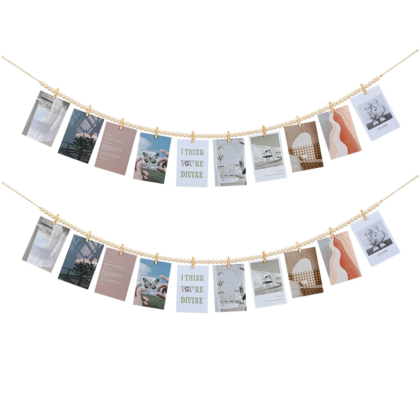 2Pcs Hanging Photo Display with Clips, Boho Wooden Bead Garland Collage Picture Frame Wall Decor, Photo String with 10 Clips for