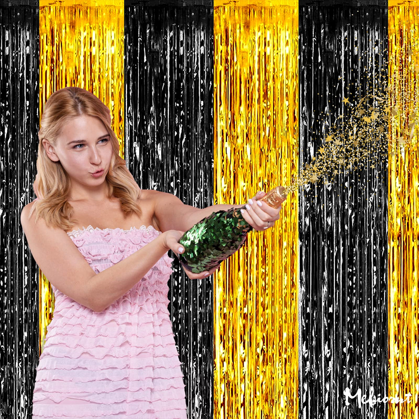 4 Pack 3.2Ft X 6.6Ft Black And Gold Fringe Curtain Backdrop, Metallic Tinsel Foil Fringe Streamers Curtains Background For Photo