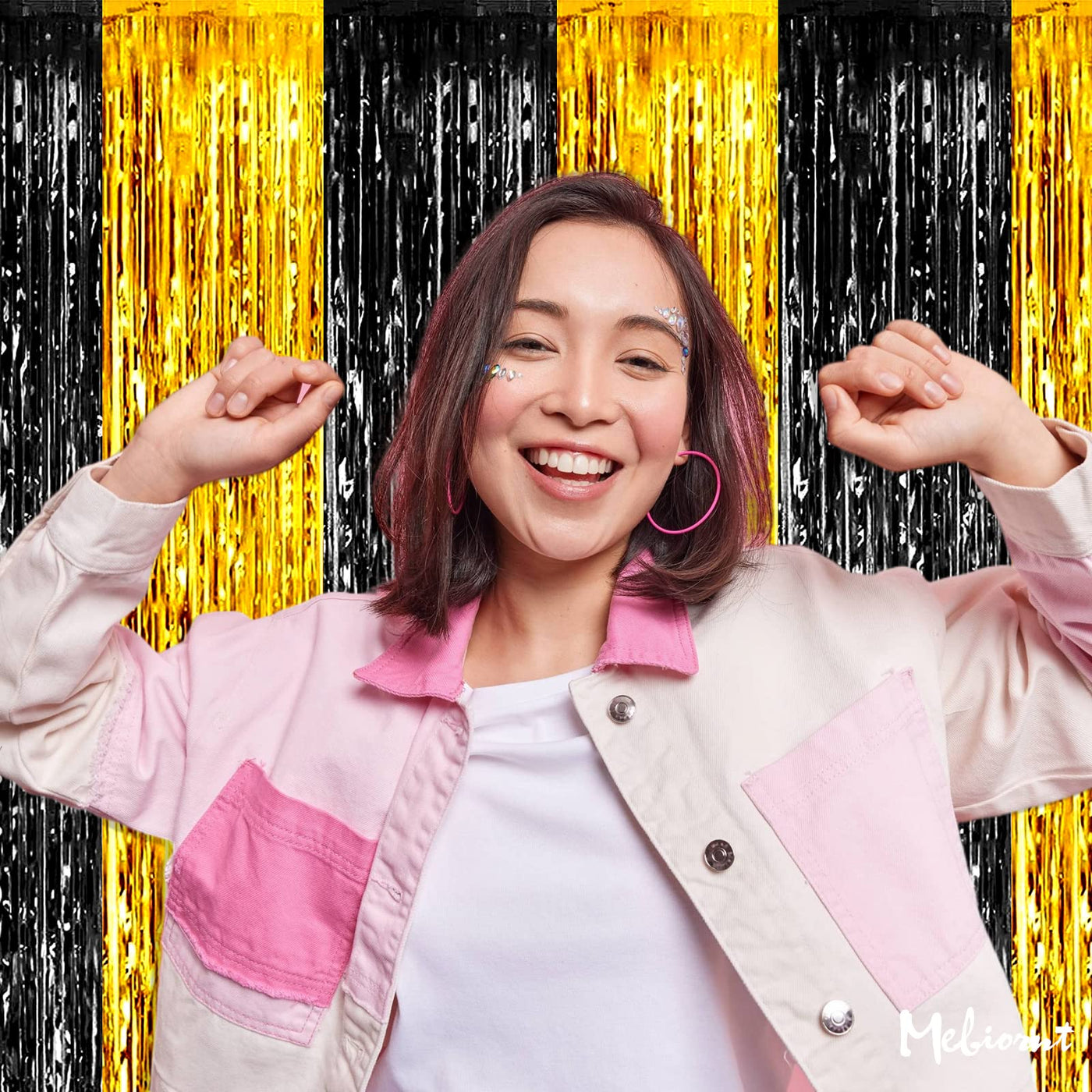 4 Pack 3.2Ft X 8.2Ft Black And Gold Fringe Curtain Backdrop, Metallic Tinsel Foil Fringe Streamers Curtains Background For Photo