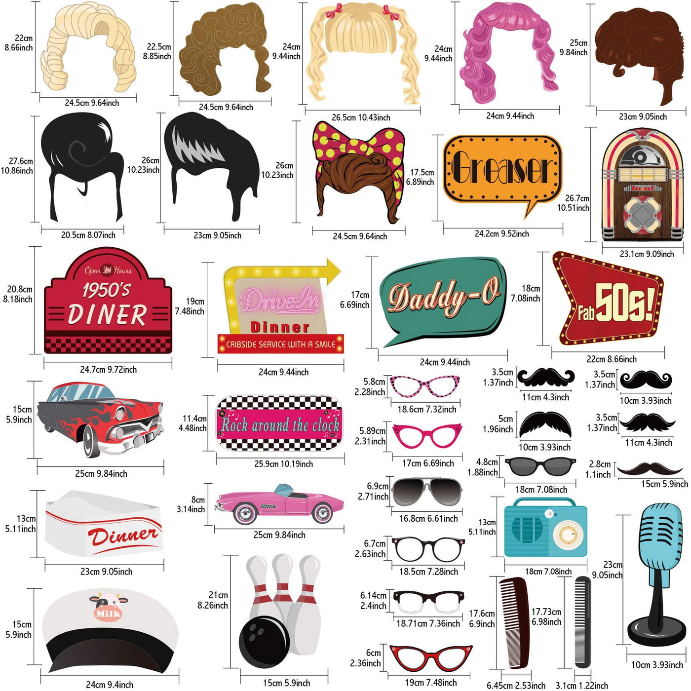 • Q: What is included in the 50s Party Photo Booth Props kit? A: The kit includes 67 items such as glasses, scarves, a bowling set, a rockstar microphone, food and drink props, and various vintage-themed signs, all designed to enhance your 50s-themed events.