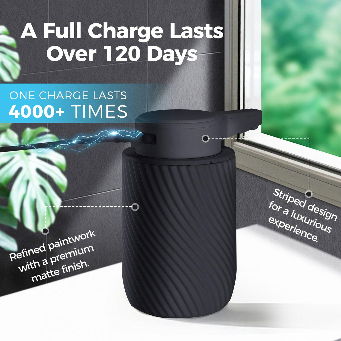 • Q: Is the soap dispenser rechargeable? A: Yes, it comes with a built-in rechargeable 1800 mAh battery that can last for up to 120 days on a single charge.