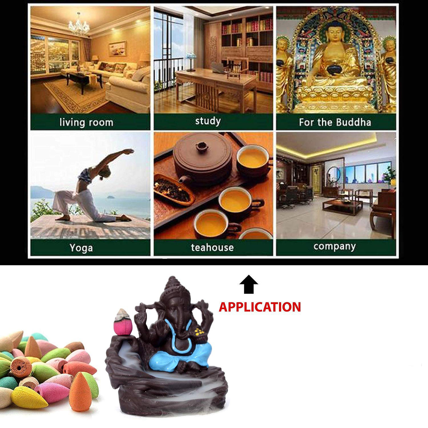 Description30 cones with each ganesh ji -BG Bazzar Presents Presents you a new Series of Incense holder Cum Showpiece Figurine Which is Back-flow incense burner creates an illusion of a smokey waterfall. This piece of art has lord Ganesh ji sitting and meditating beside the waterfall. Simply place an incense cone at the top of the waterfall, and with the cones special properties, the smoke starts to flow in reverse direction, that is from top to bottom, and in-turn creates a beautiful smokey waterfall. With scented smoke flowing in waves beside the ganesh ji, this makes the perfect housewarming gift for any home! Back-flow Ganesh ji Incense burner comes with a box of 30 back-flow incense cones. .This showpiece has been diligently handcrafted by skilled artisans using various traditional techniques