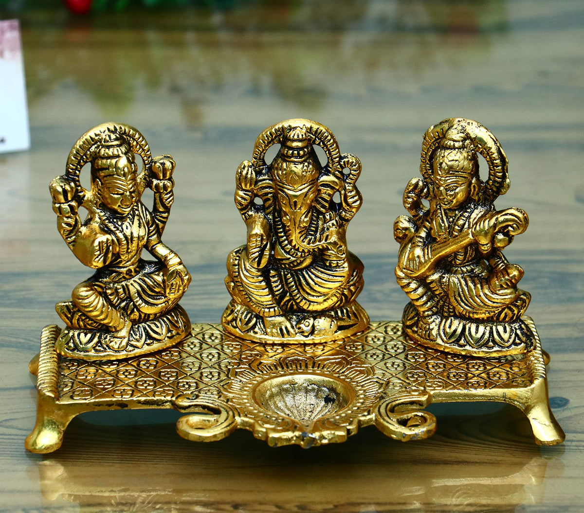Chhariya Crafts Laxmi Ganesh Saraswati With Diya Decorative Showpiece - 19 Cm (Metal, Gold)