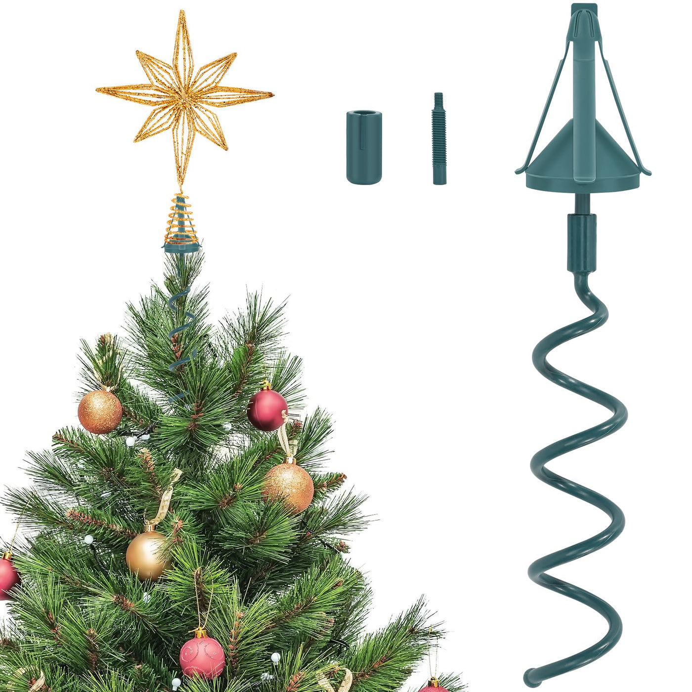 The spiral tree topper holder supports and secures most basic types of topper decorations. It comes with adjustable attachments that allow for a variety of configurations to fit tree topper bases including posts, spirals, cones, clips and topper Package includes: 1 set of Christmas tree topper holder Color: green Material: plastic Size:2.4 13.4 inches, fits tree trunks up to 1.25 in diameter Warm notes: Manual measurement, please allows slight errors on size The color might exist slight difference due to various displays