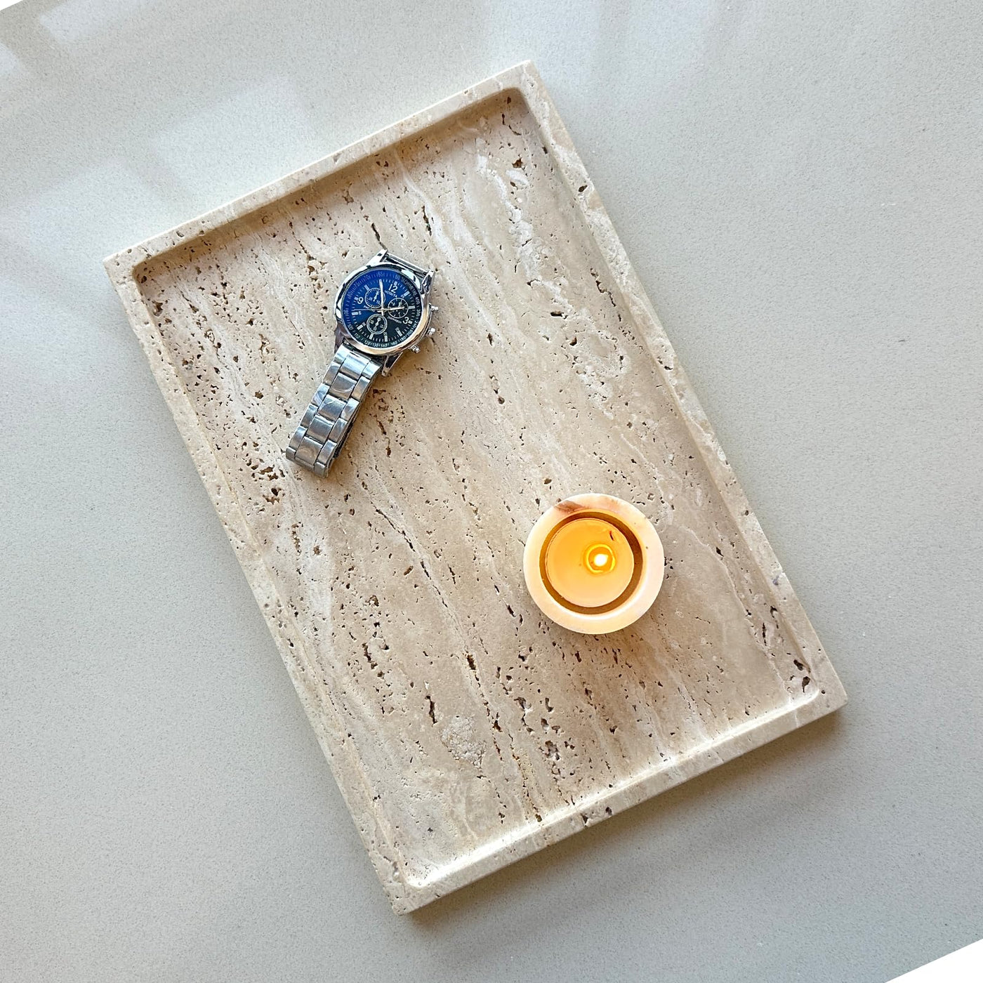 - Q: What material is the tray made from? A: The tray is made from high-quality Travertine stone, known for its natural beauty and durability.