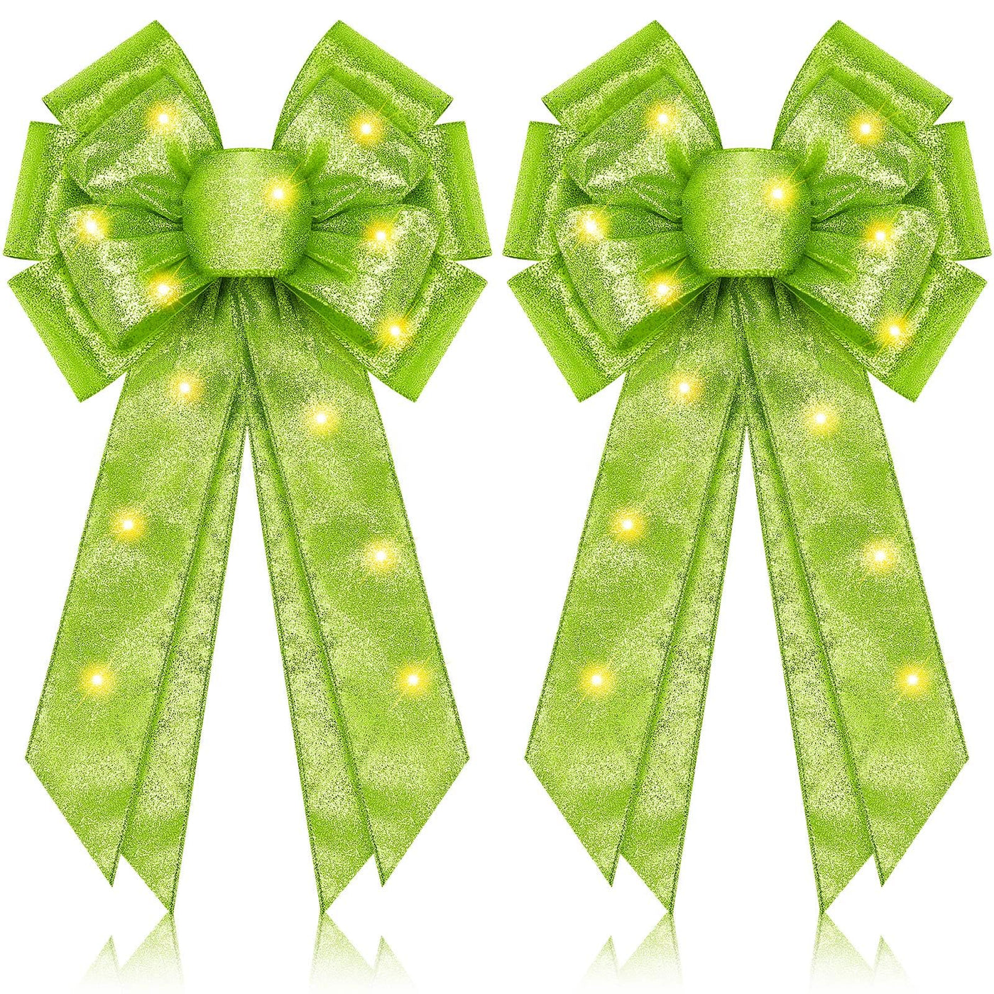 Giegxin 2 Pcs Large Lime Green Lighted Christmas Bows with Lights for Wreath and Tree Topper, 18x10 Inch Pre Lit Wreath Bow Ligh