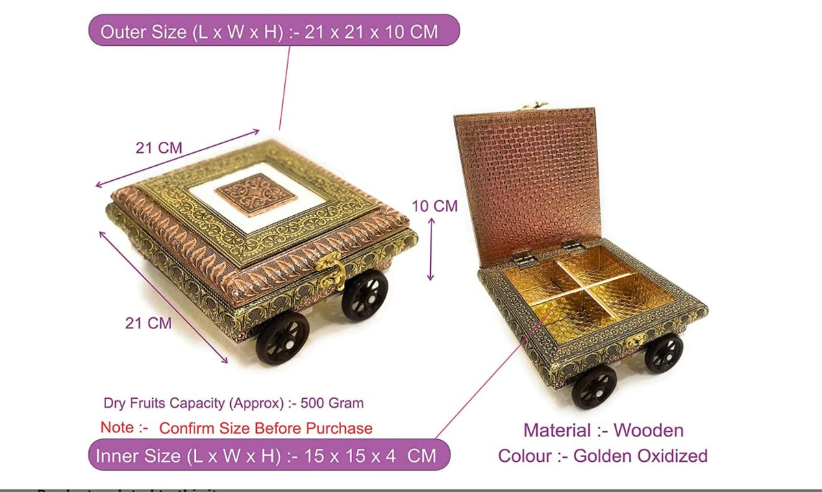 Material : Hand-crafted Traditional Rajasthani Stylish German Oxidised Art Work. This Dry Fruit Box has Four sections wherein you can easily arrange Dry Fruits, Chocolate, Mouth Freshener, Sweet. It adds beauty to your dining table, house warming, festival occasion. A designer Gift with Traditional Work. You Can impress your Special Guests with this return Gift. Unique design with good quality. One of the best gifting option for any occasion like Showcase, pooja and also Festival.