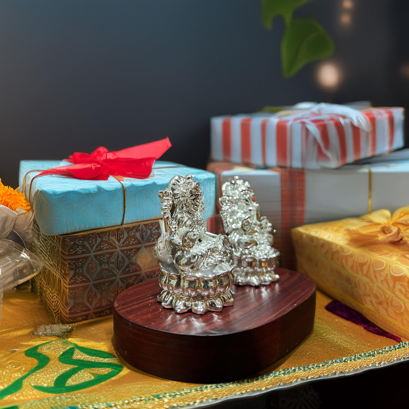 Idolkart 999 Silver Plated Ganesh Lakshmi Murti On A Wooden Base | Small Size (3 Inch) | Ganesh Laxmi Idol For Diwali Puja, Gifting, Home, Office