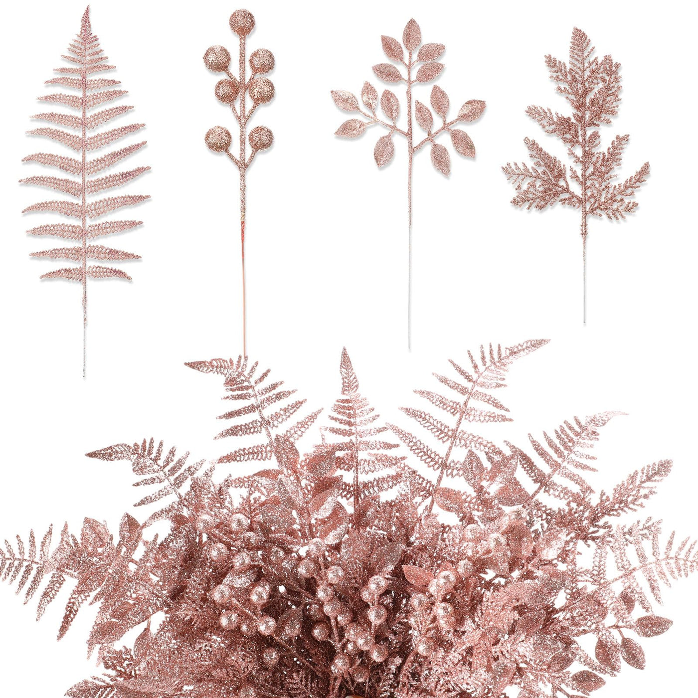 Moucuny 40 Pcs Christmas Glitter Artificial Picks Set Christmas Leaf Sprays Cedar Picks Glitter Berries Stems Tropical Leaf Pine