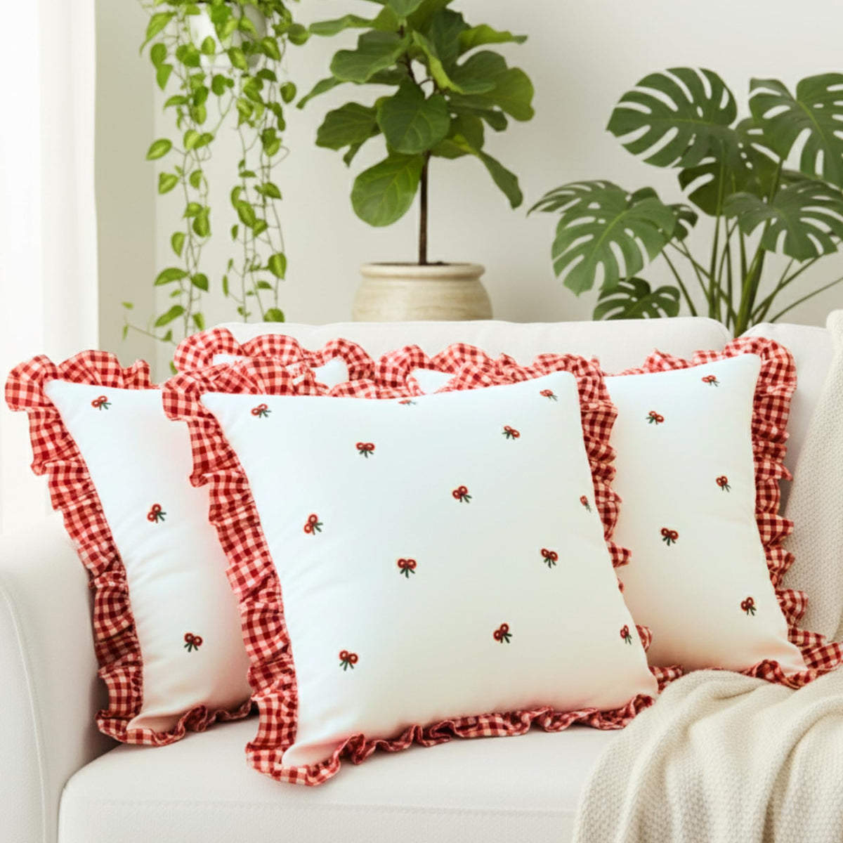 Sleepy Threads Cotton Cushion Cover Red & White | Set Of 3 | Square Floral Embroidered With Ruffle Frill Edging Throw For Sofa,L