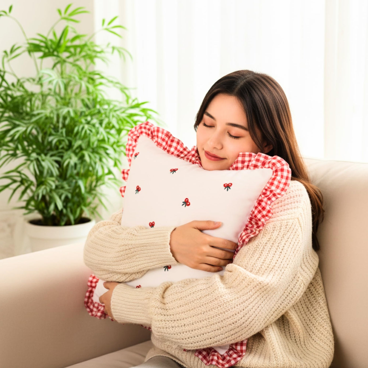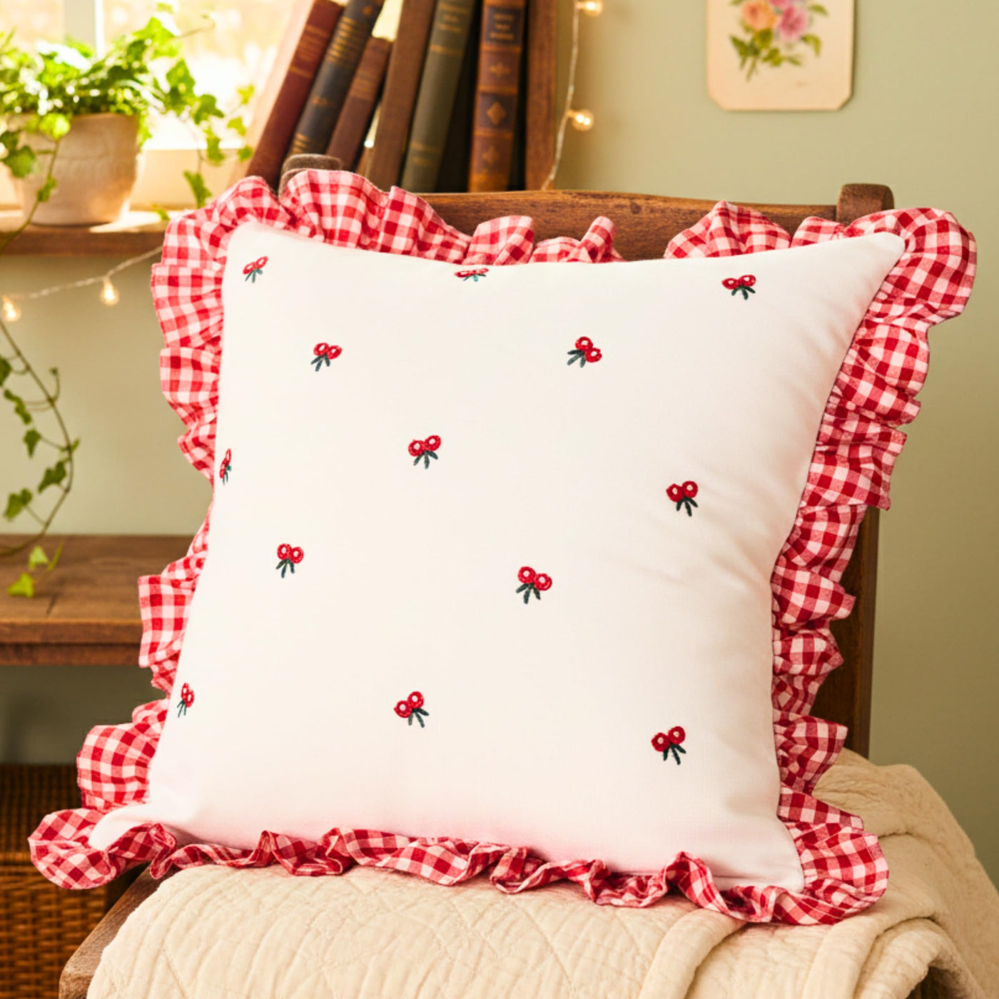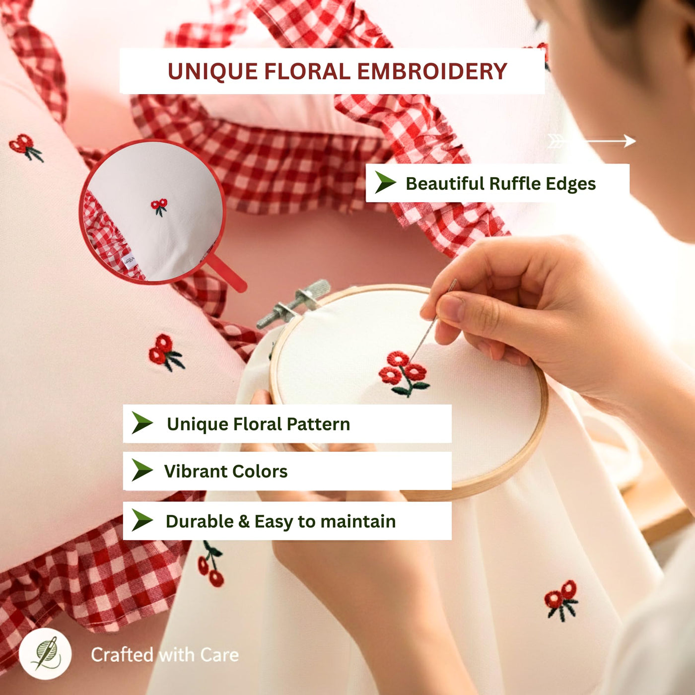 Sleepy Threads Red & White Square Cotton 180 Tc Cushion Cover Floral Embroidered | Set Of 5 | With Ruffle Frill Edging , 16X16 I