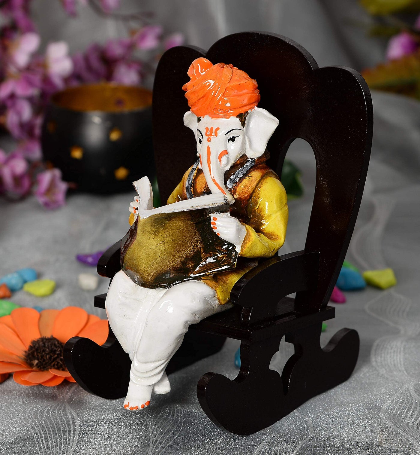 Sn Handicrafts Resin Ganesha Resting On Rocking Chair Figurine, Standard, Multi Colour
