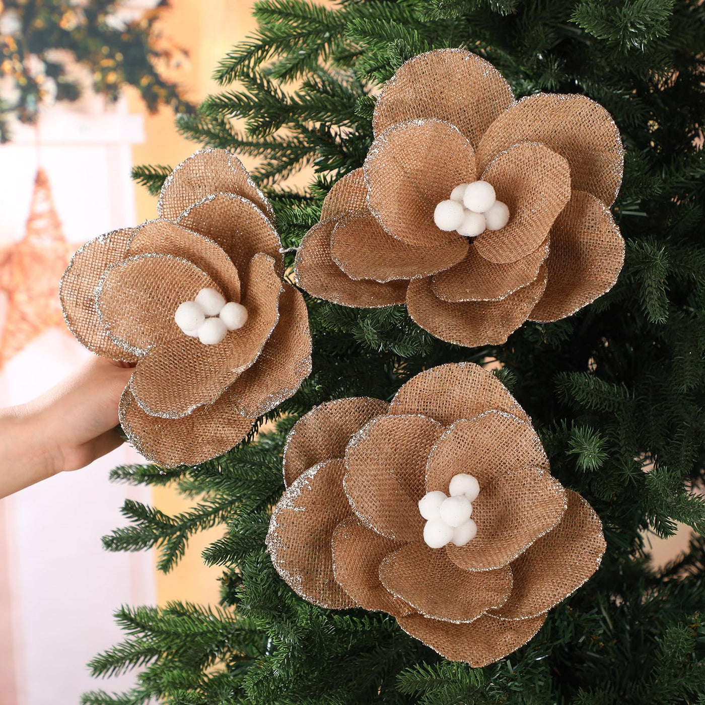 Features: Suitable size for Christmas decorations: The diameter of the poinsettia flower is about 9.8. The Poinsettia Flowers set comes with 12 Pcs clips which just insert the clip into the stem hole, and clamp it in any position. These Beautiful Glitter poinsettia flowers added the suitable touch to Christmas tree. Theyre the idea size and color. Decorations For Christmas: These poinsettia makes Christmas tree shine. These flowers look nice and are nice for filling in those larger bare spots on the tree. Made tree look full and elegant with these Christmas poinsettia decorations, you will get tons of compliments from family and friends. The suitable finishing touch for Christmas tree Specifications: Material: burlap fabric Color: burlap Size: Poinsettia flower is about 9.8 inch/ 25cm Stem is 6 inch/ 15cm Package includes: 12 X Poinsettia 12 X Stem Notes: Manual measurement, please allow slight errors on size. The color may exist a slight difference due to different screen displays