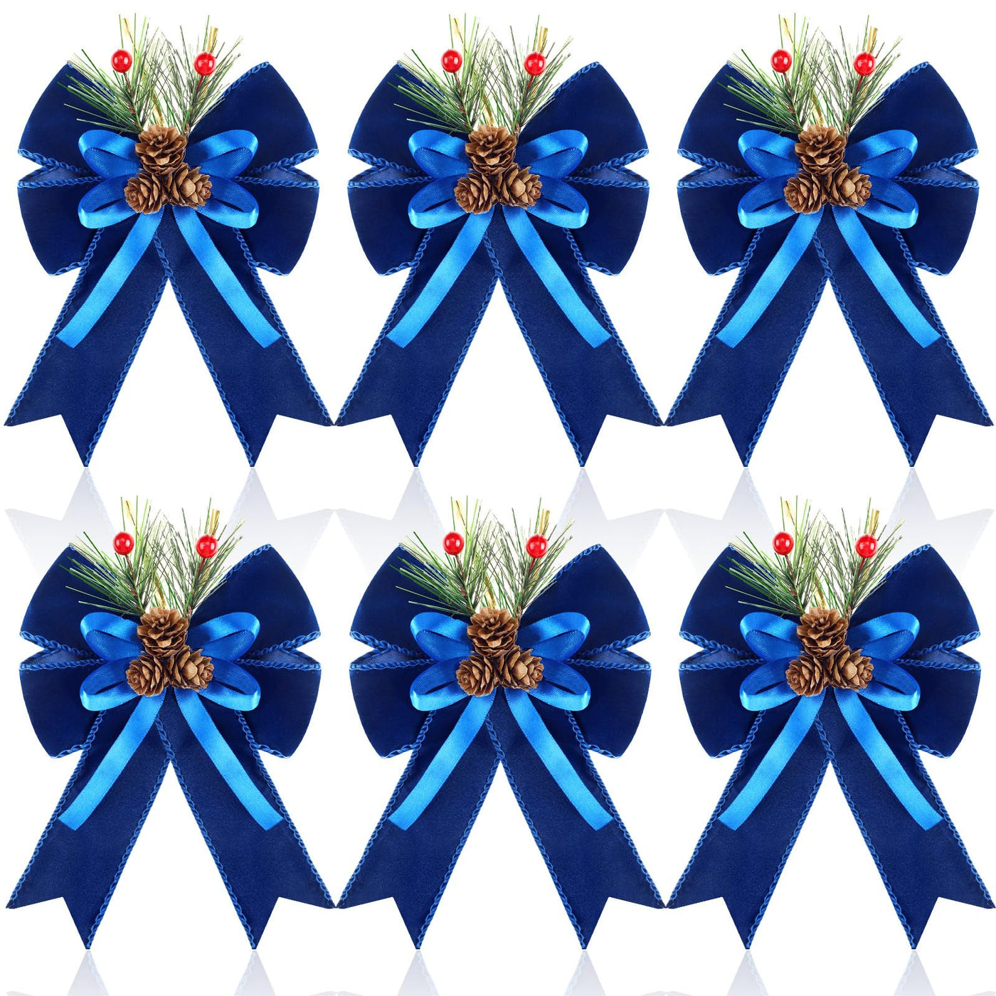 Syhood 6 Pcs Christmas Bows with Pine Cones Pine Needles Xmas Blue Velvet Bows Blue Velvet Ribbon Christmas Tree Wreath Decorati