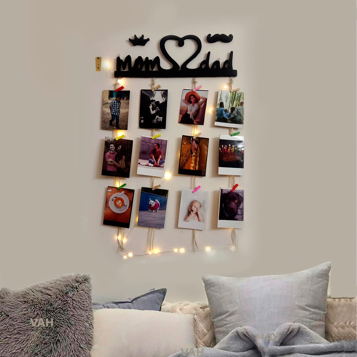 Vah Wooden Photo Frame With Led Light - Display Picture Collage Organizer With Clips (Mom And Dad With Light)