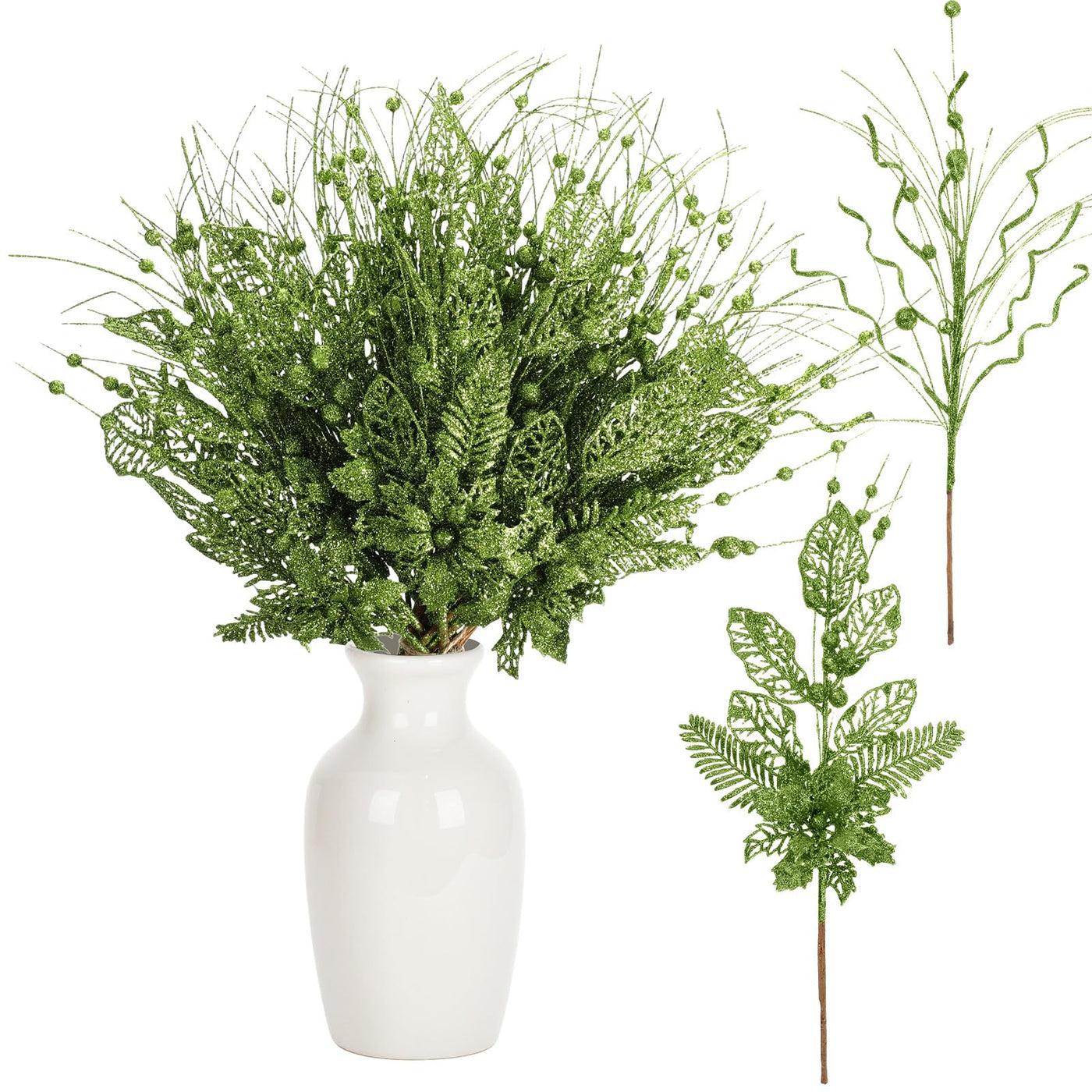 Yunlly 24 Pcs Green Christmas Tree Picks and Sprays Glitter Berry Stem Branches Artificial Christmas Picks Twigs Xmas Tree Ornam