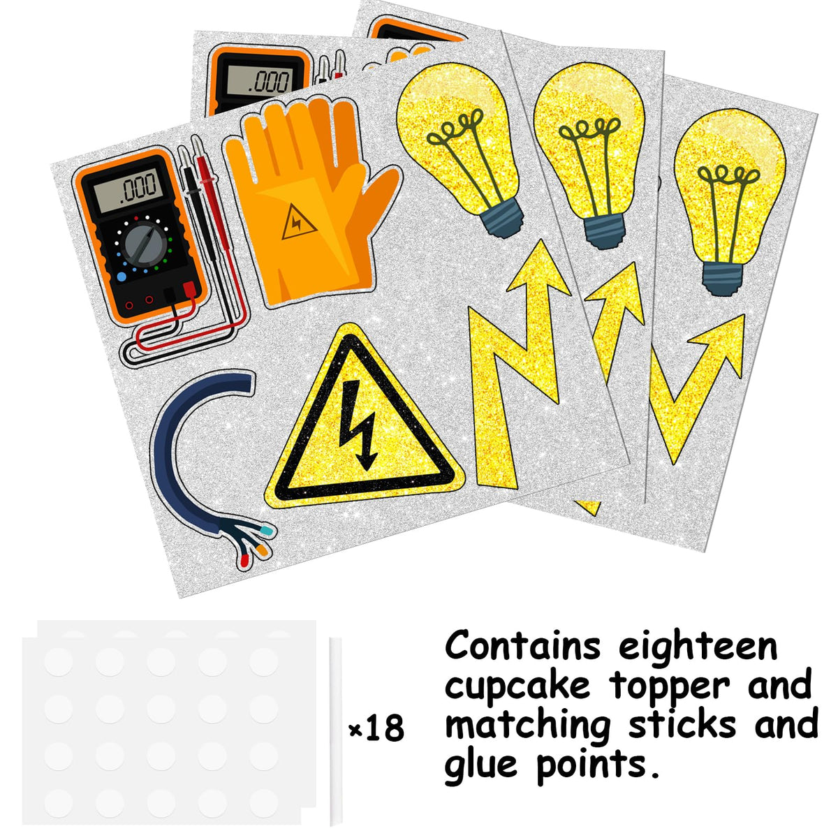 • Q: What is included in the package? A: The package includes 18 pieces of cupcake toppers that feature a sparkly design and are made of high-quality cardboard, fully assembled for easy application.