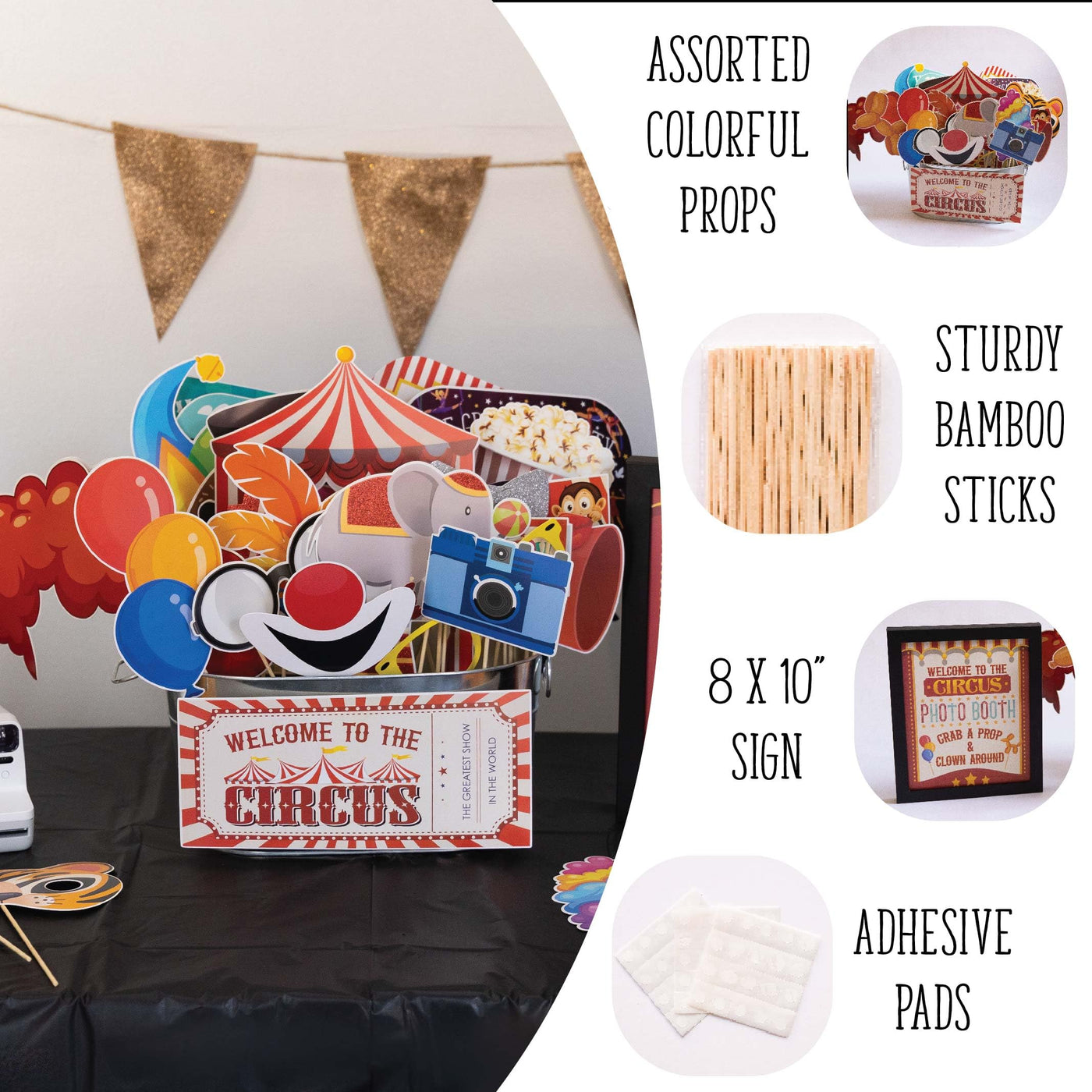 Carnival Photo Booth Props - 41-Pc Photobooth Kit With 8 X 10-Inch Sign, 60 Adhesive Pads, 45 Sticks - Circus Theme Party Decora