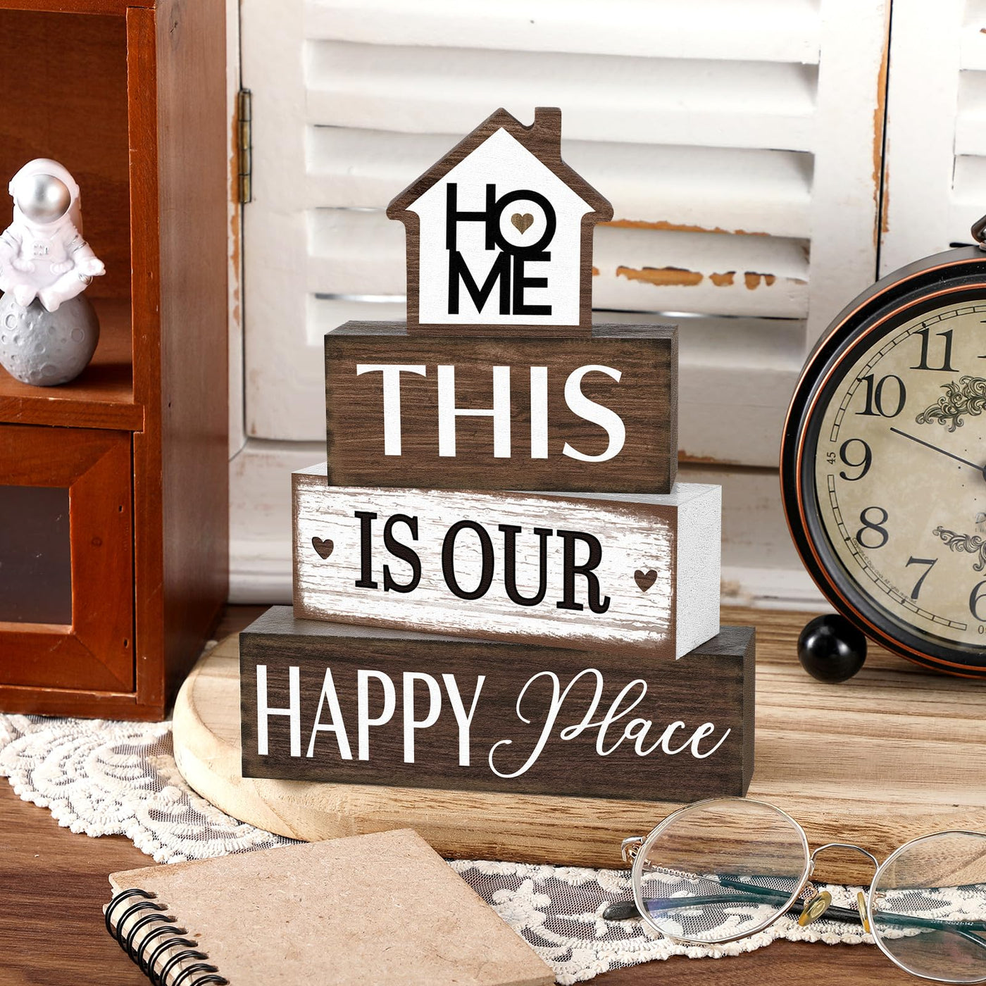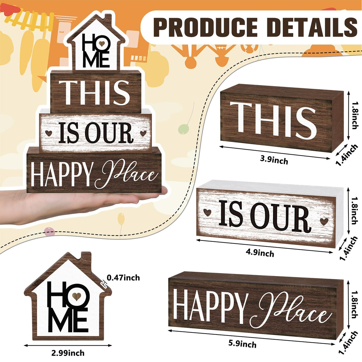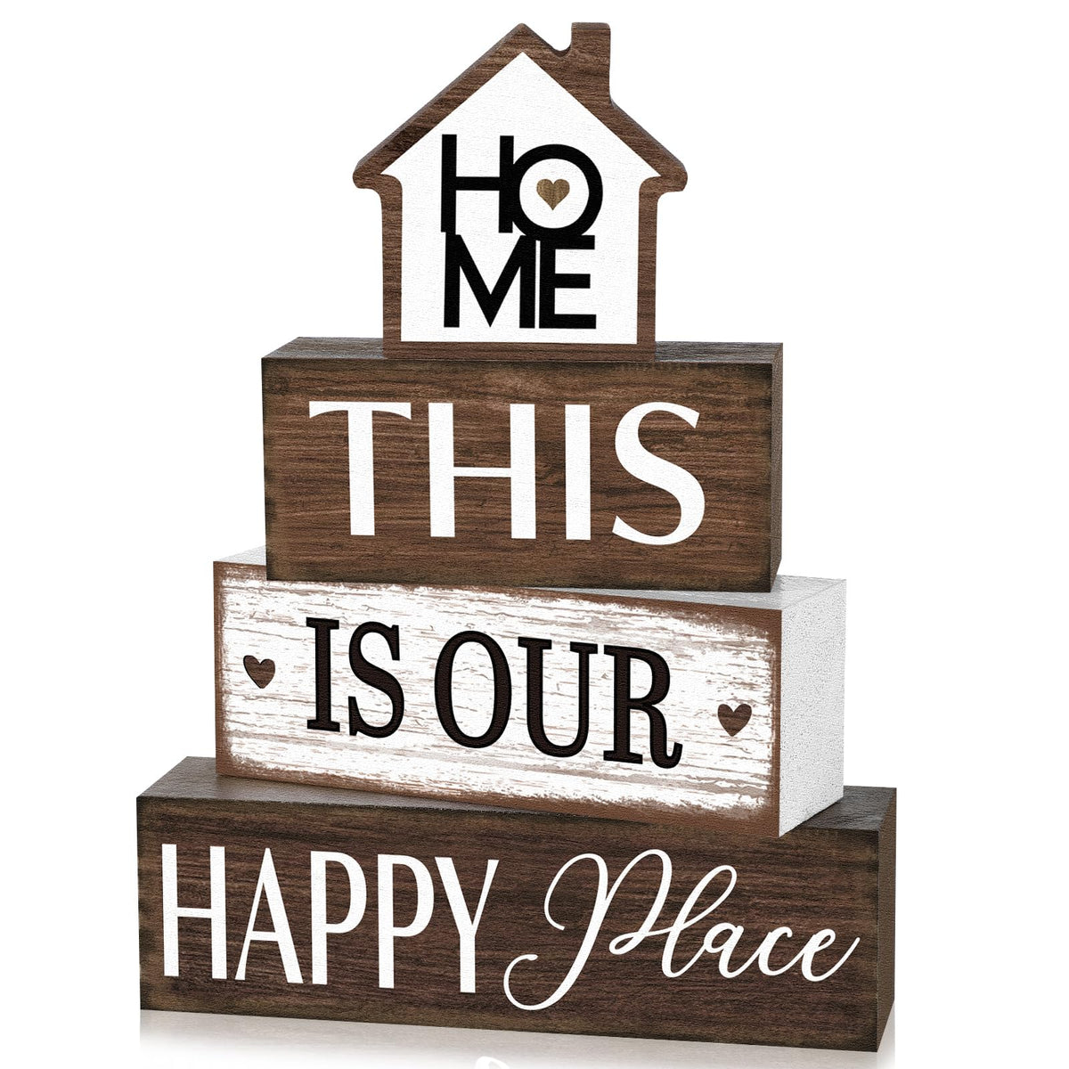 Features: We ensure high value and satisfaction by offering a complete package of 4 wooden tabletop decors. You can display them collectively for a blended aesthetic appeal, or separately across your home to create uniformity in your home decor, the choice is entirely yours Our tabletop decor does not require any cumbersome set-up. Simply place the wooden decor on your chosen spot, and it will immediately add style and elegance. Made from durable wood, these units are easy to clean and maintain, offering stress-free elegance for years to come Specifications: Material: Wood Color: black, White Size: the rectangular blocks about: 5.91 x 1.77 x 1.38 inches/ 15 x 4.5 x 3.5 cm, 4.92 x 1.77 x 1.38 inches/ 12.5 x 4.5 x 3.5 cm, 3.94 x 1.77 x 1.38 inches/ 10 x 4.5 x 3.5 cm Package includes: 4 x Farmhouse Wooden Tabletop Decor Notes: Manual measurement, please allow slight errors on size. The color may exist a slight difference due to different screen displays.