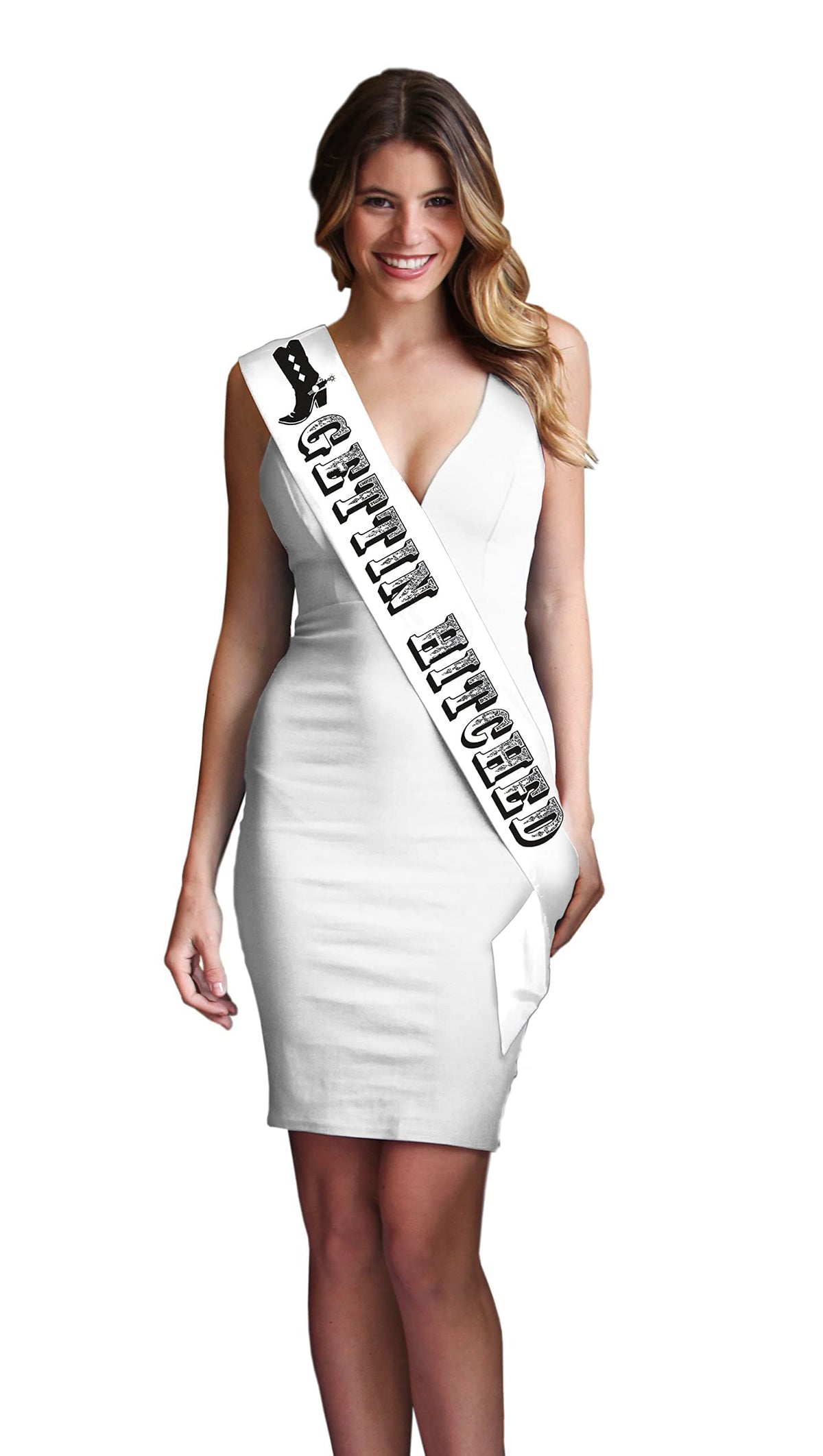 • Q: What does the sash say? A: The sash features fun gold foil lettering that says 'Gettin’ Hitched' and 'Bride’s Posse'.