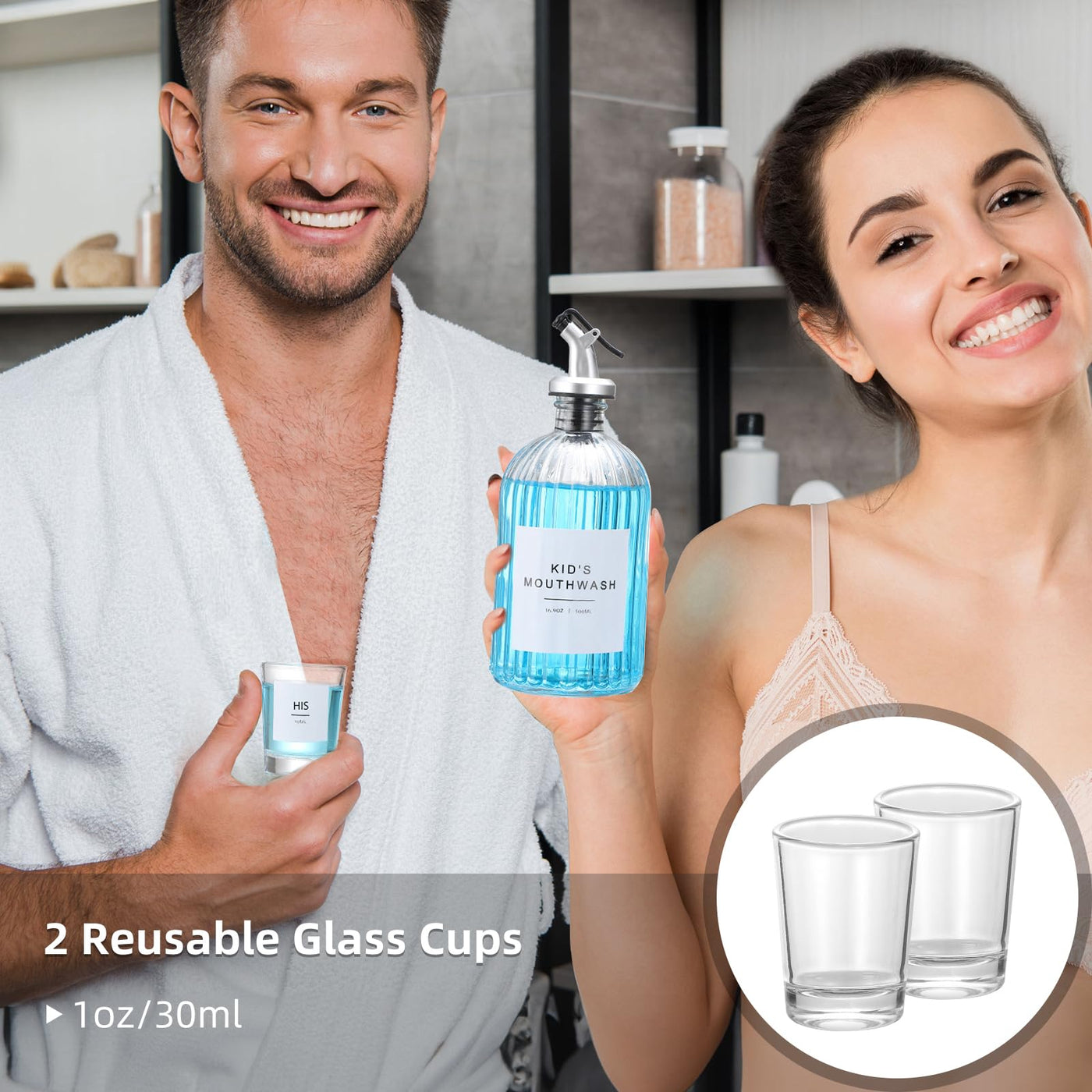 Glass Mouthwash Dispenser, 2 Pack 16.9Oz Glass Bottles With Pour Spouts, 2 Reusable, 21 Paper Cups With Holder, Funnel And Label