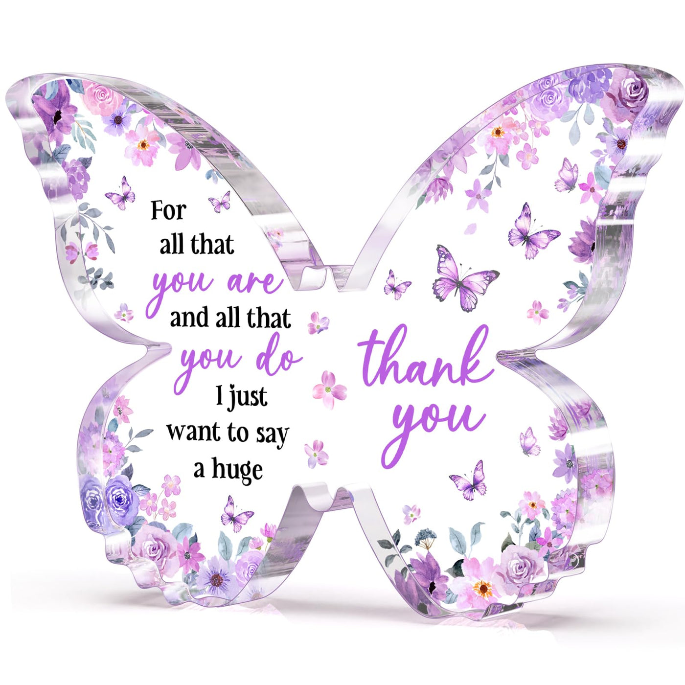 Thank You Gifts for Women Are you looking for thank you gift for women? Our butterfly gift is the perfect choice! No one can resist such cute decoration. You can never go wrong giving our appreciation gifts for women on wedding thank you, teacher appreciation day, boss day, nurses week, birthday party, Christmas or Thanksgiving. ?or all that you are and all that you do, I just want to say a huge thank you.?/p> 100% Satisfaction Guaranteed: Any questions about the product, you can contact us at any time, and we will solve it within 24 hours. Specifications: Material: acrylic Color: purple Size: 5*3.8*0.5 inches