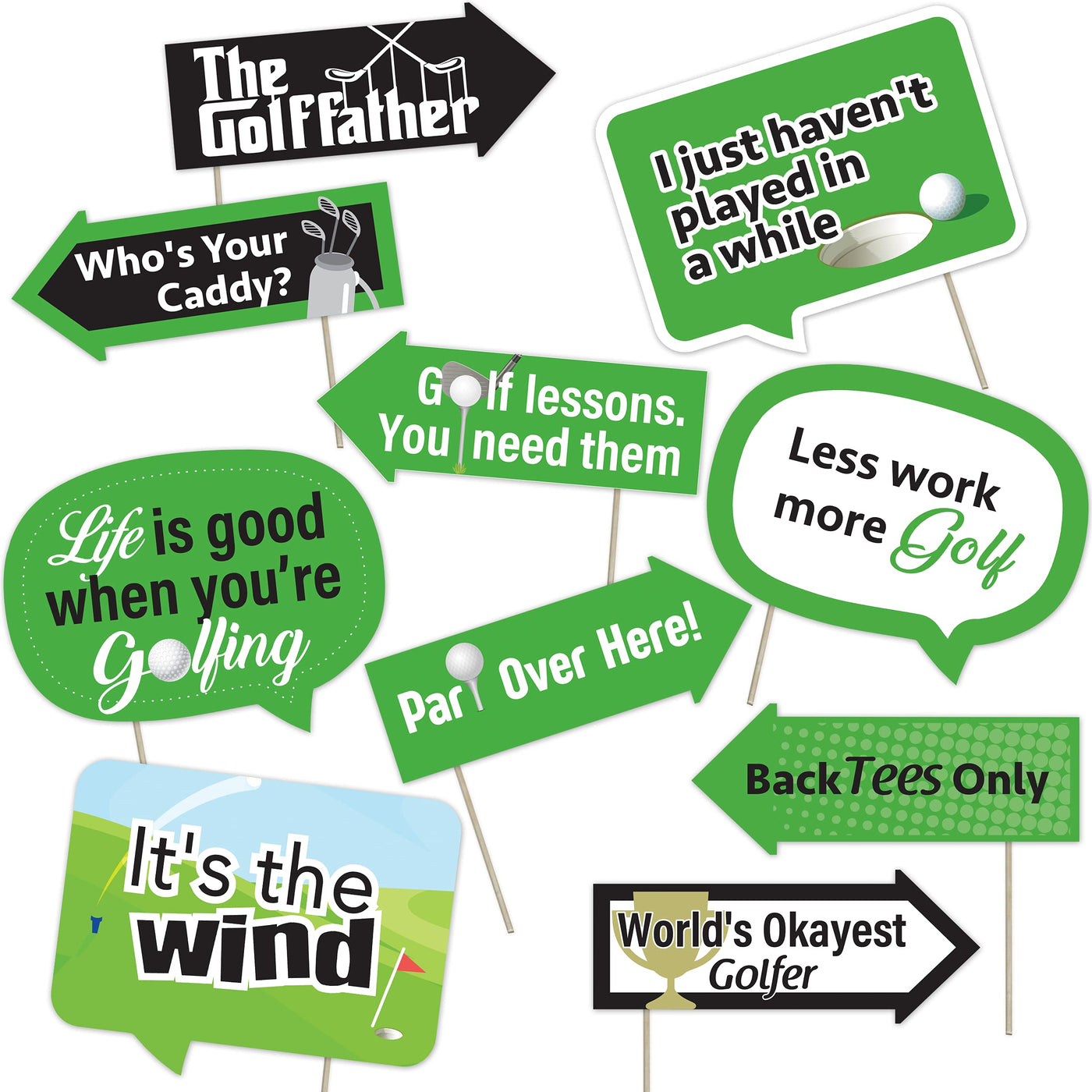 - Q: What is included in the Golf Photo Booth Props Kit? A: The kit includes 10 arrow and speech bubble photo booth props, along with 10 bamboo sticks and the adhesives required for easy assembly.