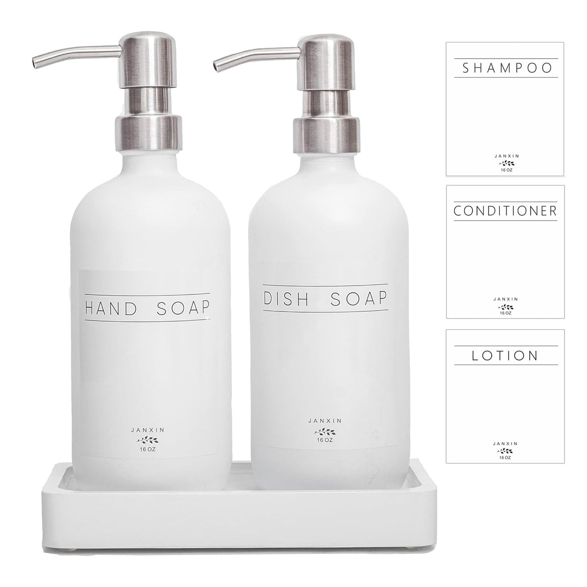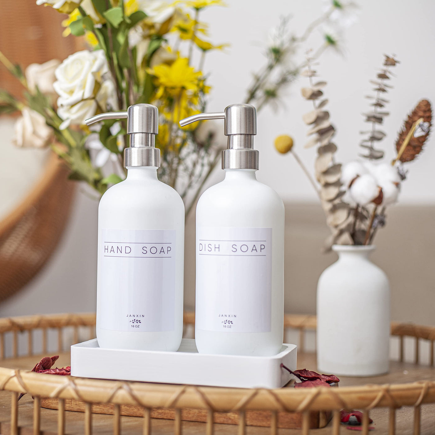 Janxin Glass Soap Dispenser for Kitchen 16oz Morden Hand and Dish Soap Dispenser with Stainless Steel Pump and Wood Tray Bathroom Soap Dispenser with Waterproof Labels (White Bottles+Silver Pumps)