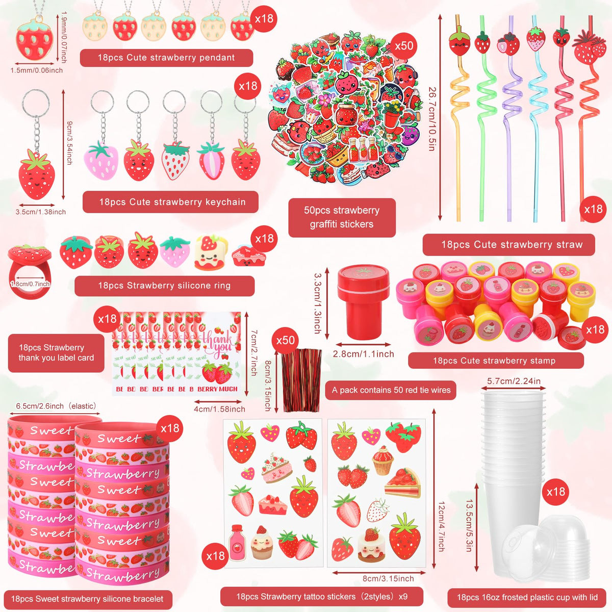- Q: What items are included in the Landical Strawberry Party Favors? A: The Landical Strawberry Party Favors include 213 pieces: 18 stampers, 18 temporary tattoos, 18 keychains, 18 rings, 18 pendants, 18 tags, 18 gift cups with lids, 18 straws, and 18 bracelets, along with a bag of red ties and 50 sheets of stickers.