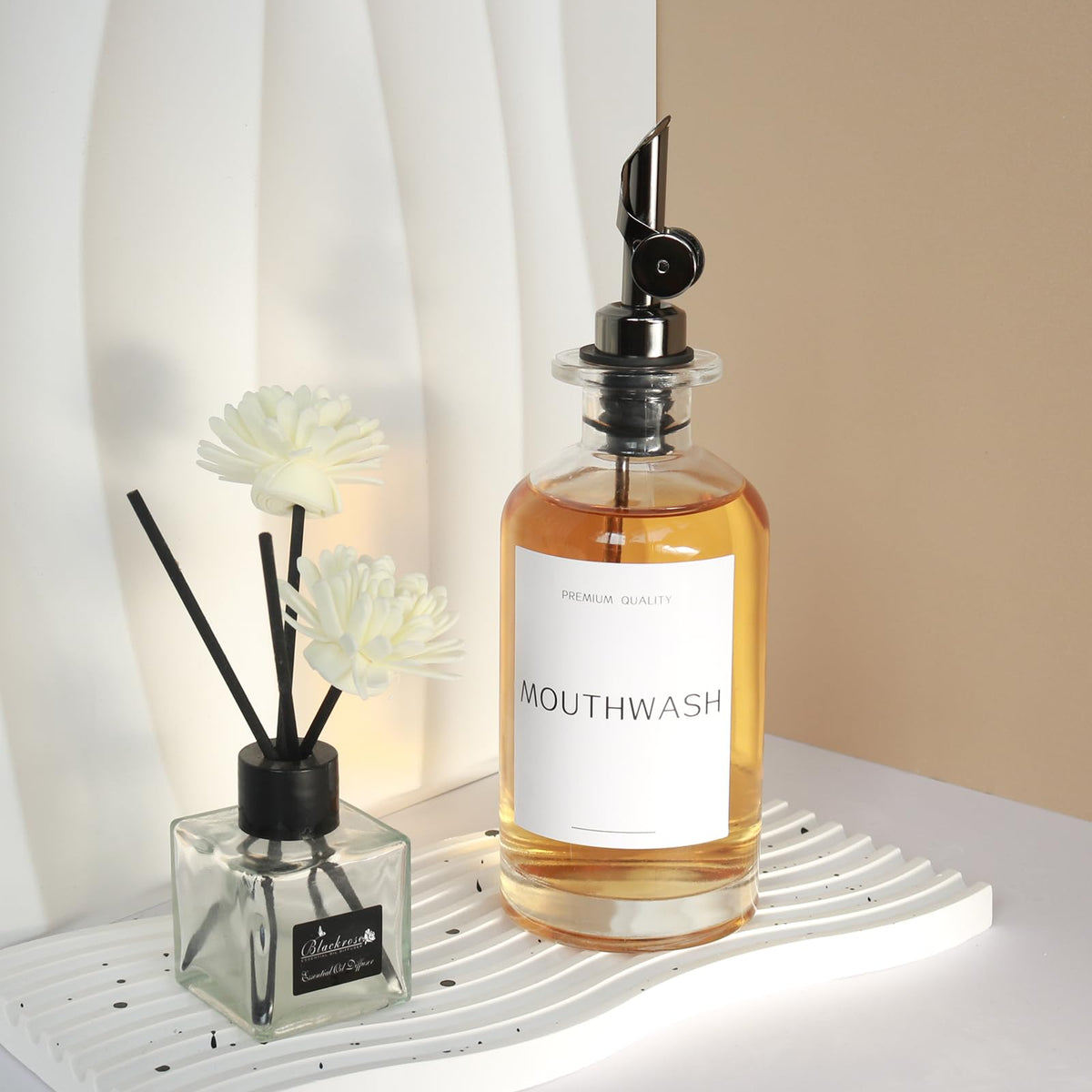 Mouthwash Dispenser For Bathroom, Clear Glass Mouth Wash Container With Stainless Steel Pour Spout, Refillable Mouthwash Bottle