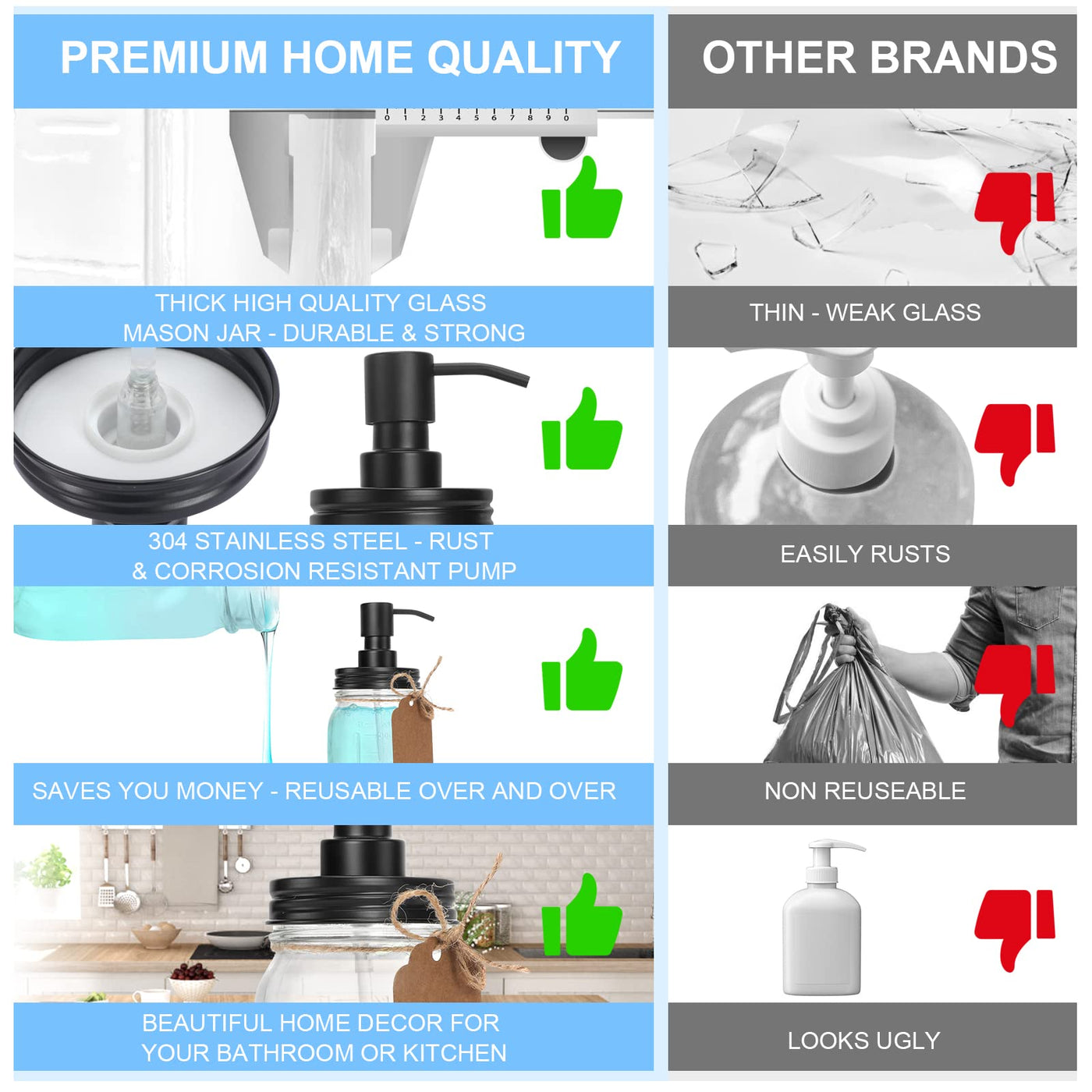 Premium Quality Mason Jar Soap Dispenser - Black 16 Ounce - Made From Rust Proof Stainless Steel - Dish And Hand Soap Dispenser