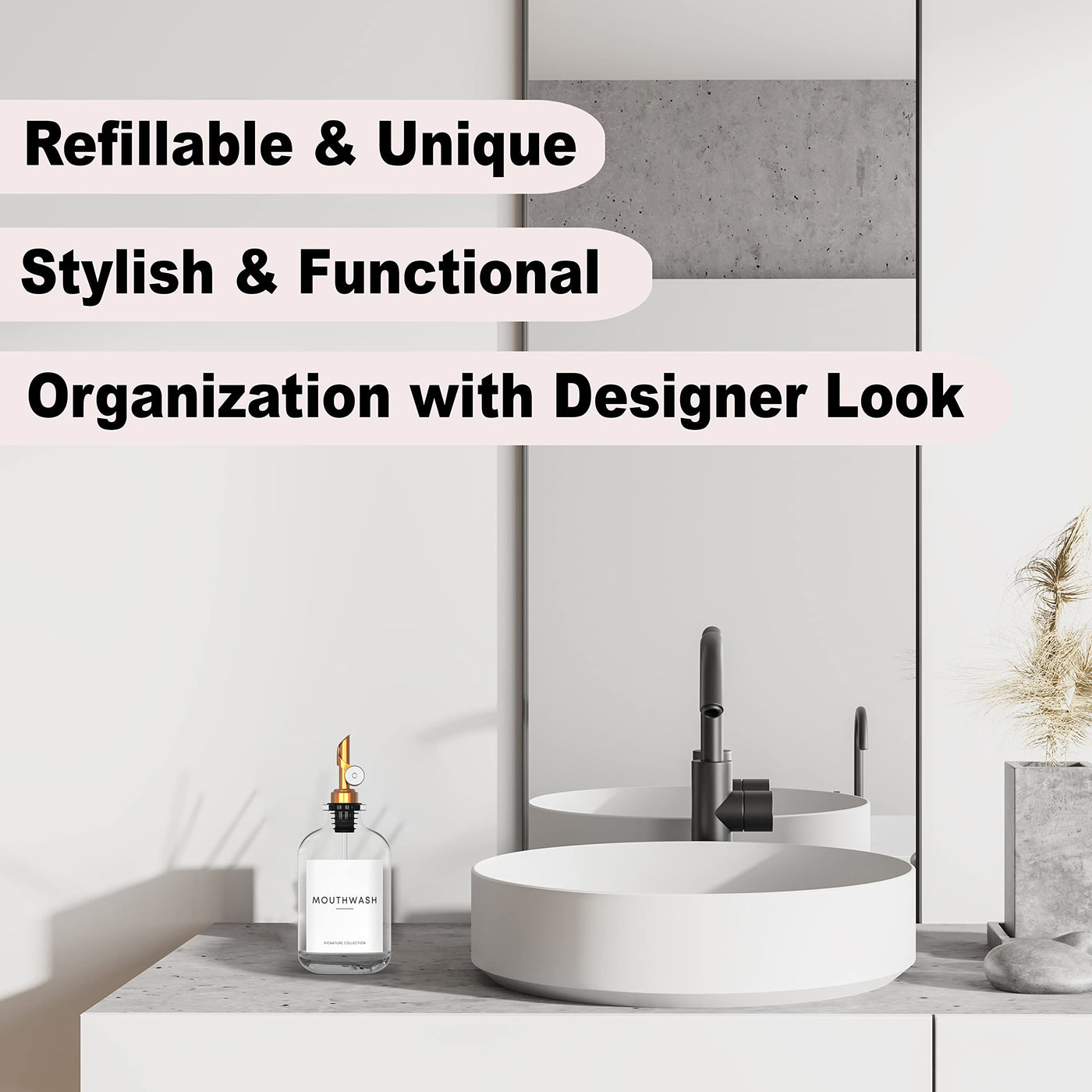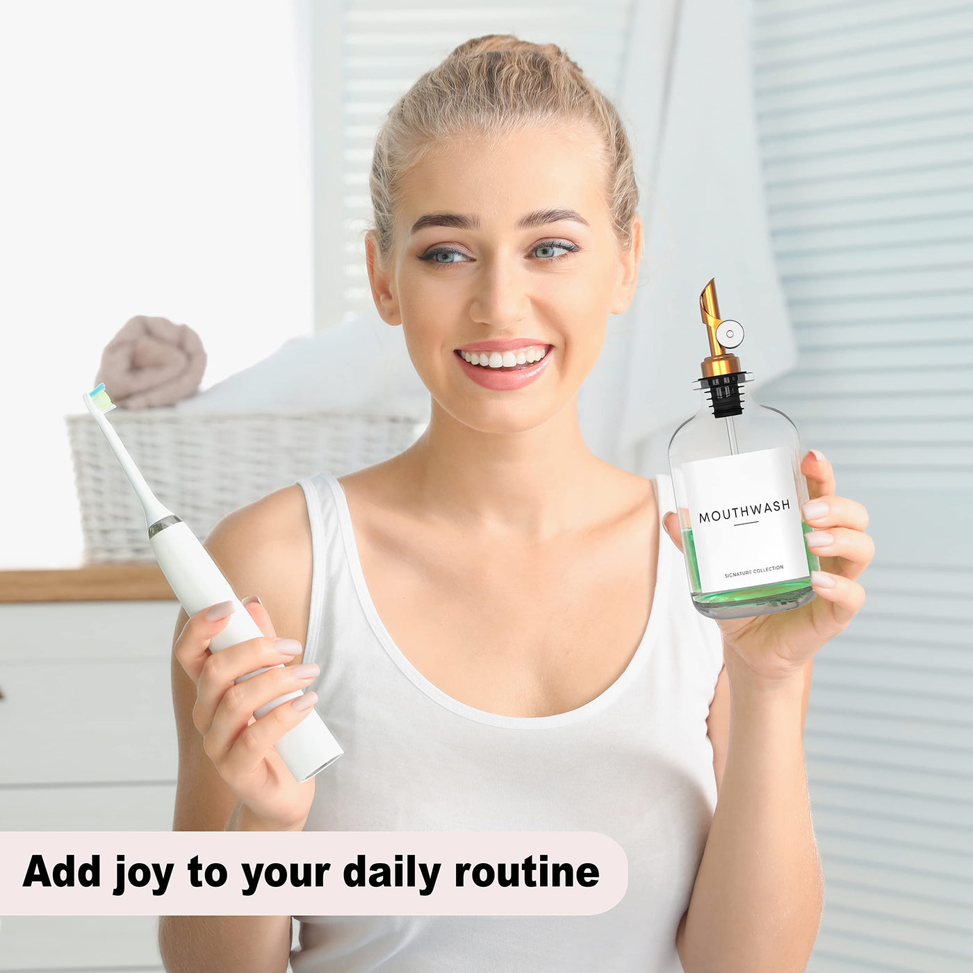 Washee Mouthwash Dispenser For Bathroom - Glass Mouthwash Container (12.7 Oz) With Weighted Pour Spout & 4 Mouthwash Bottle Labe