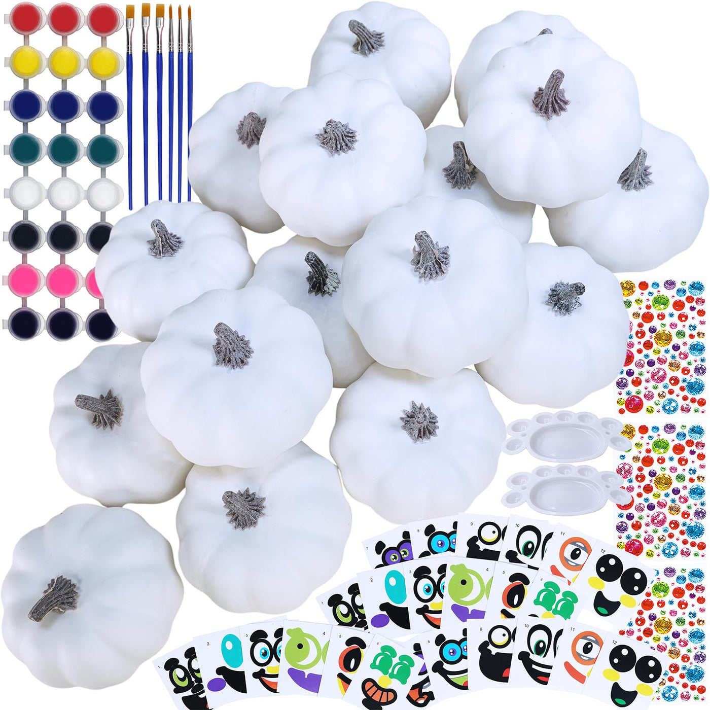 Set of 16 Paint Your Own Pumpkin Craft Kits: This no-carve pumpkin painting kit is perfect for all ages. It includes all the necessary supplies for an easy and enjoyable painting experience. Unleash your creativity and bring a festive vibe to the season! Its also an art and craft kit for kids that stimulates imagination, fine motor skills, concentration, and color recognition. Endless Decorating Possibilities: - Use different colored paints to design the white pumpkins into green Frankenstein, black cats, weird monsters, red devils, wicked witches, vampire, owl, bat, etc. - Transform these craft pumpkins into no-carve Jack-o-Lanterns using the included pumpkin face stickers. This pumpkin decorating kit provides a safe and no mess alternative to traditional pumpkin carving. - Try different painted pumpkin approaches like stripes and dots, color-blocking, mark-making, or fingerprint. You can go bold and bright or modern pastel, choose a simple color palette or mix the paint to adjust the colors. - You can enhance its appeal by gluing on embellishments, such as ribbons, beads, seasonal elements, or whatever you like. Adding a Festive Touch to Your Fall and Halloween: - Table Centerpiece: Showcase your small painted pumpkins as a centerpiece on your Thanksgiving table or as a charming addition to your Halloween decor. - DIY Crafts: Enhance your fall wreaths, garland, and swags with these decorative pumpkins for a one-of-a-kind touch. - Gift Giving: This pumpkin craft set is great for gift-giving, especially during the fall season, Halloween gatherings, or birthday parties. After creating your masterpiece, share it with friends and family as a special keepsake. - Home Accents: Display the painted pumpkins on the front porch, mantel, entryway table, patio, buffet, table, set them out on the windowsill, shelves, kitchen countertop, cabinet, end table, around a bench, chair, ladder, or stack them on some crates to liven up your home with a festive atmosphere.