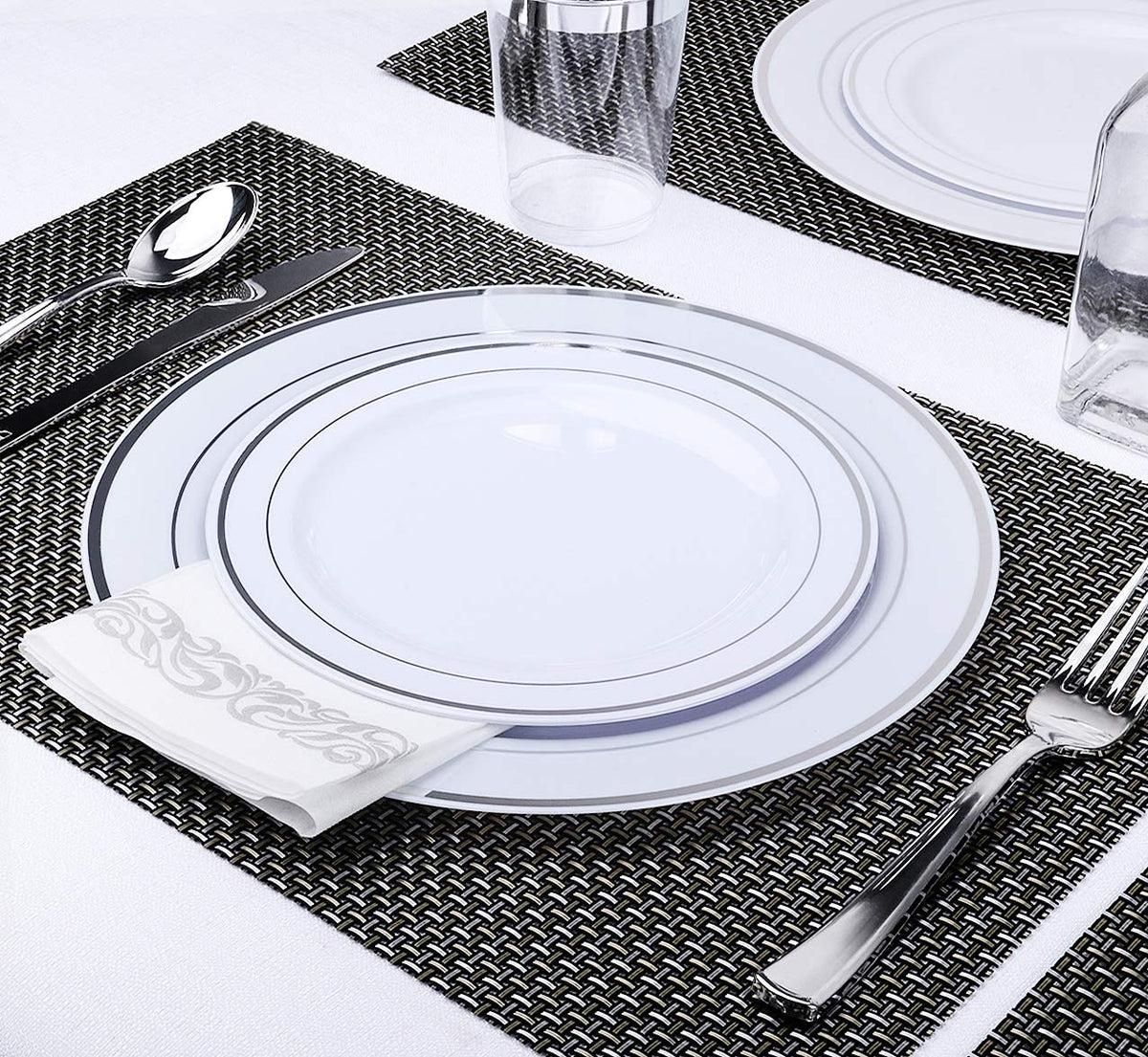 - Q: Are the plates in this set disposable? A: Yes, all the plates in the MCIRCO Silver Dinnerware Set are disposable, making cleanup easy after your event.