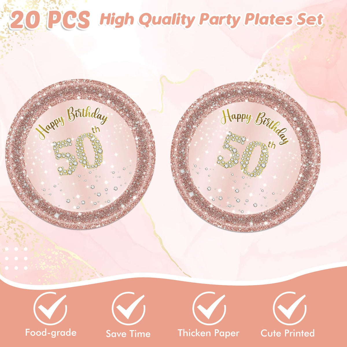- Q: What is included in the 41Pcs 50th Birthday Decorations set? A: The set includes 20 pieces of 7'' rose gold party paper dinner plates, 20 pieces of 6.5'' rose gold Happy 50 birthday paper napkins, and 1 tablecloth.