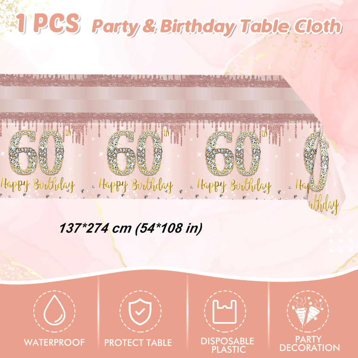 41Pcs 60Th Birthday Decorations, Rose Gold Birthday Party Supplies Include 20Pcs Plates 20Pcs Napkins And 1Piece Tablecloth, Swe