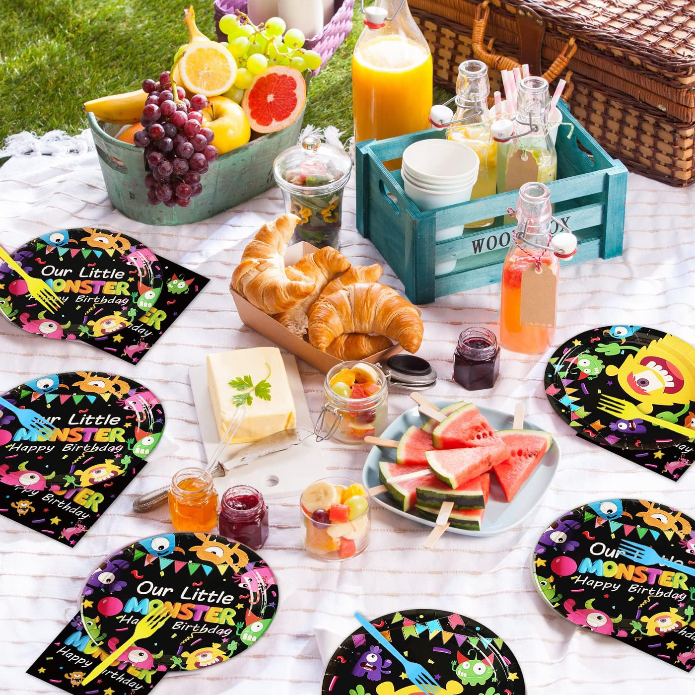 • Q: Do the plates and napkins come with any specific design? A: Yes, the plates and napkins feature colorful monster designs that enhance the festive mood of the party.