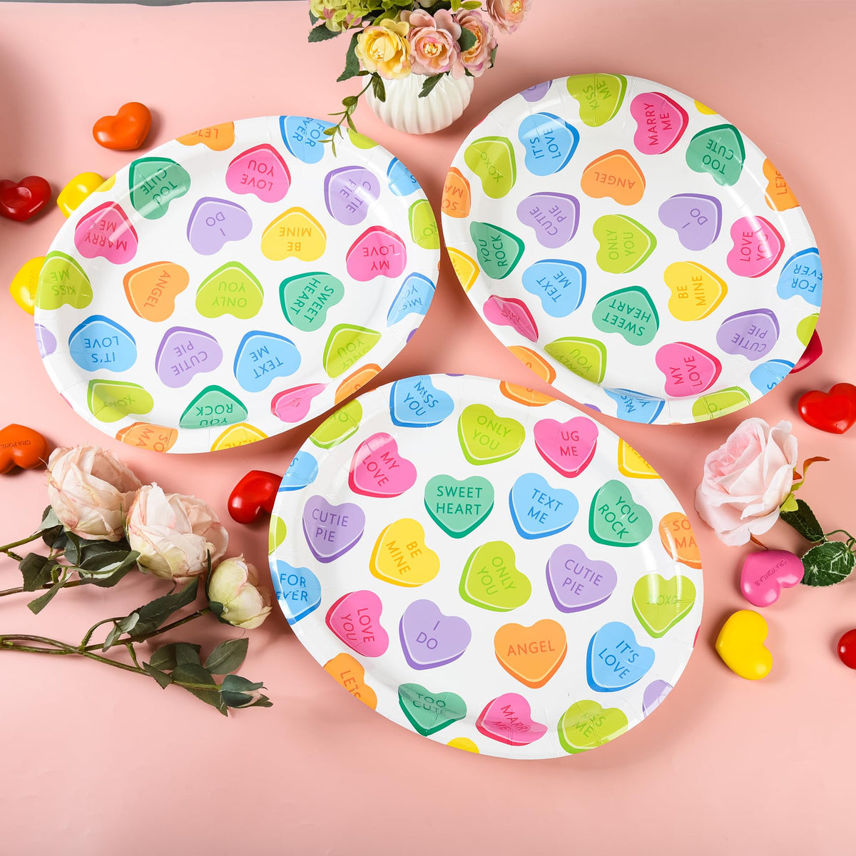 - Q: Do the plates feature any specific designs? A: Yes, the plates feature colorful love hearts with romantic sayings, adding a festive touch to your celebration.