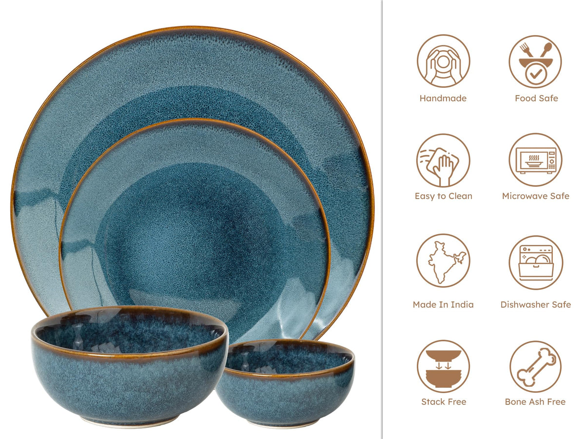 Bodhi House Handcrafted Stoneware Reactive Glaze Ceramic Dinner Set, 20 Pieces Serving For 6, Microwave And Dishwasher Safe, Bone-Ash Free, Crockery Set For Dining And Gifting, Greenish Blue