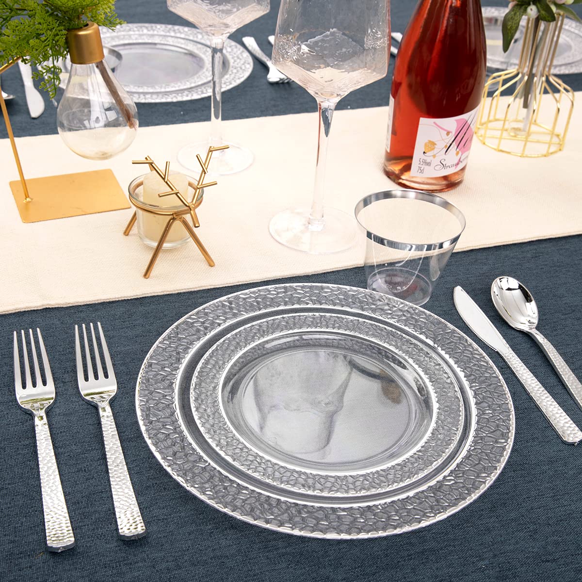 Ciaell 150Pcs Clear Silver Plastic Plates - Silver Disposable Plates Include 25Dinner Plates, 25Dessert Plates, 25Forks, 25Knive