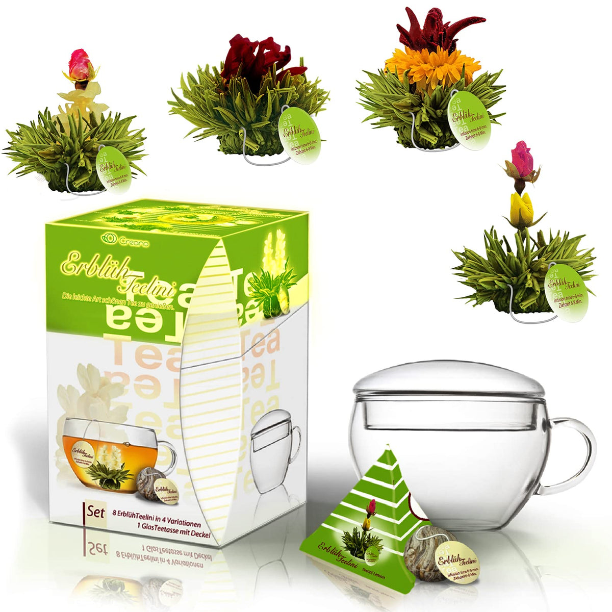 - Q: What is included in the Creano Bloomning Tea Gift Set? A: The Creano Bloomning Tea Gift Set includes 8 different tea flowers in 4 varieties of green tea, along with a glass tea cup that has a lid.
