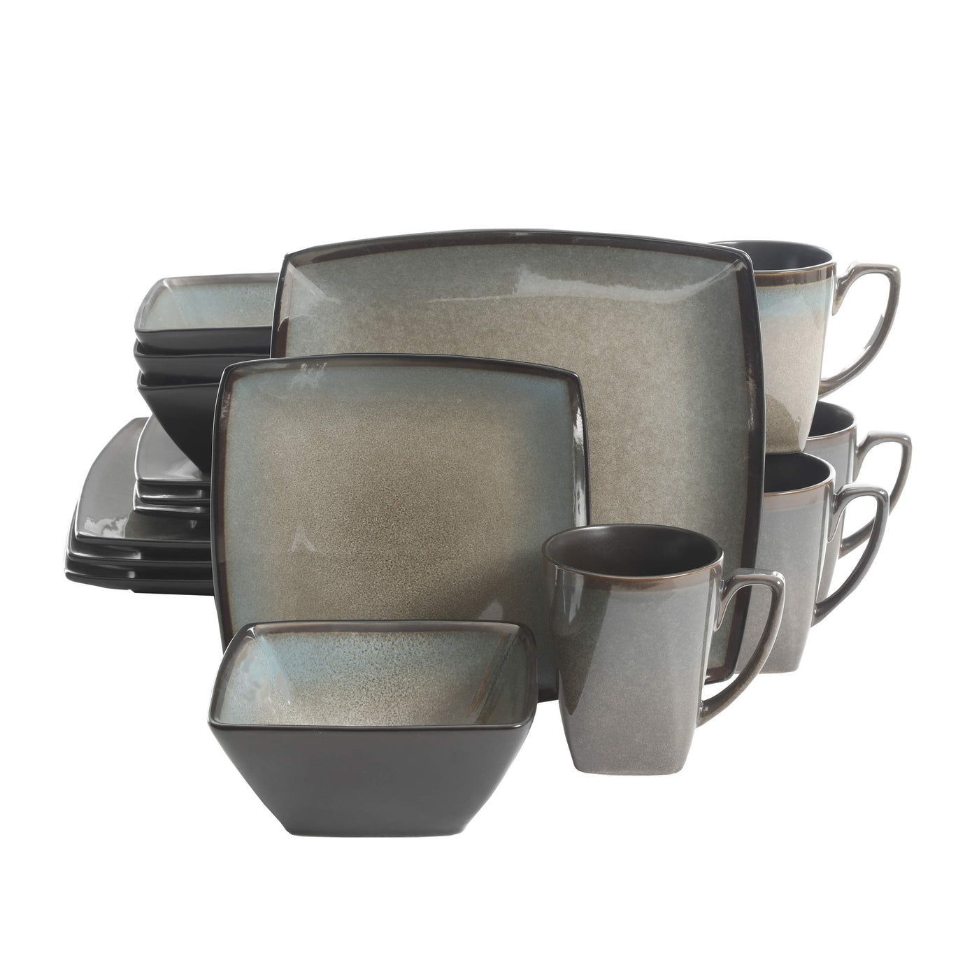 Gibson Elite Tequesta Square Reactive Glaze Stoneware Plates and Bowls Dishes Dinnerware Set, Service for 4 (16pcs), Taupe