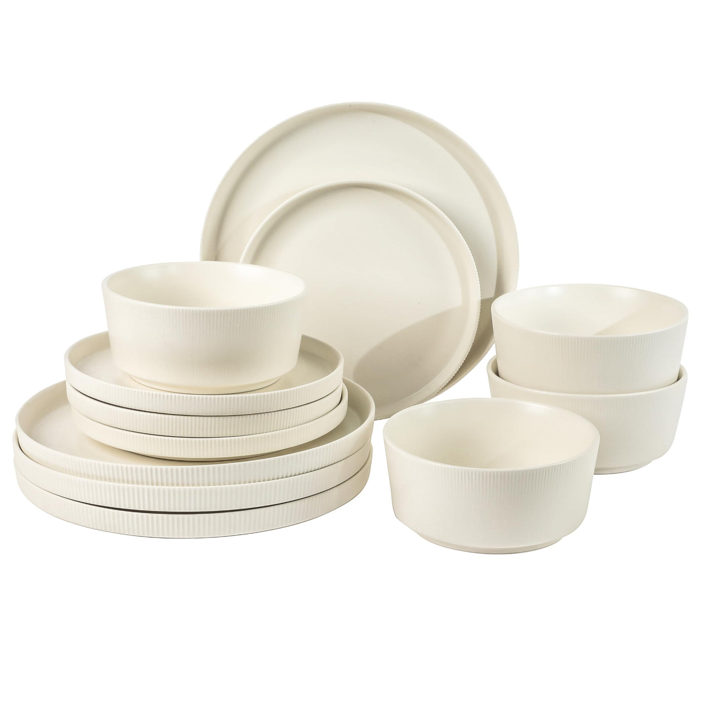 Gibson Home Dempsey Road 12-Piece Stoneware Dinnerware Set - Service for 4, Round White Plates and Bowls, Durable Solid Color Mo