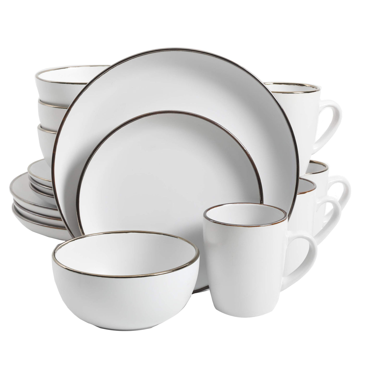 Gibson Home Rockaway Round Stoneware Dinnerware Set, Service for 4 (16pcs), Matte White/Metallic Rim