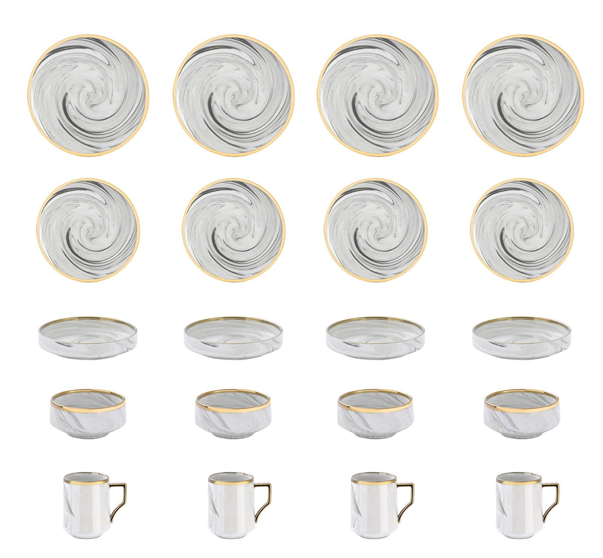 • Q: Does the set have any special design features? A: Yes, the set features a handcrafted marbled design with a wide gold line decoration, adding an artisan touch that makes it attractive and suitable for various occasions.