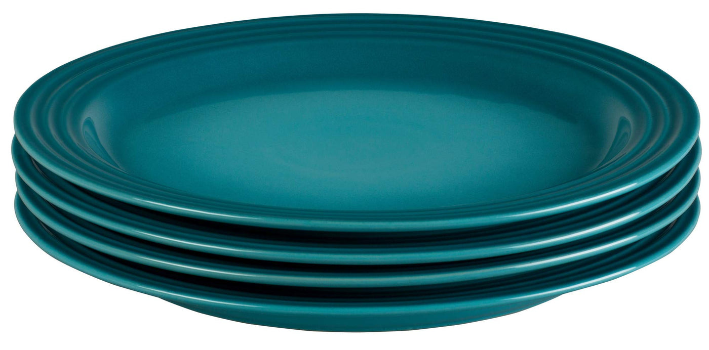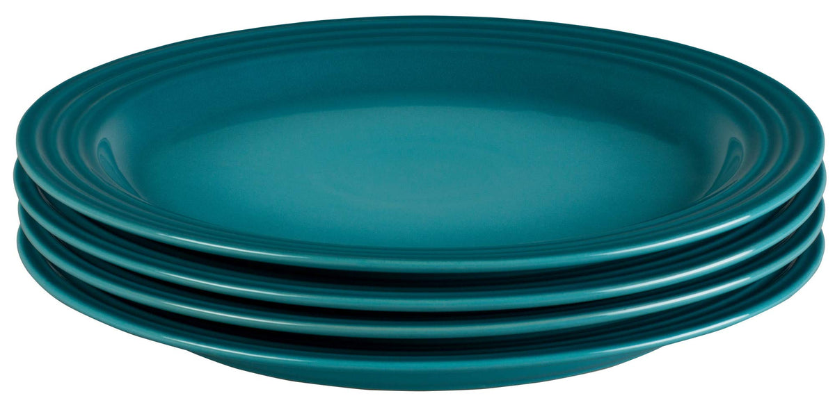 • Q: What is included in the Le Creuset Stoneware Dinnerware Set? A: The set includes four 10 1/2 inches dinner plates, four salad plates, four soup bowls, and four mugs.