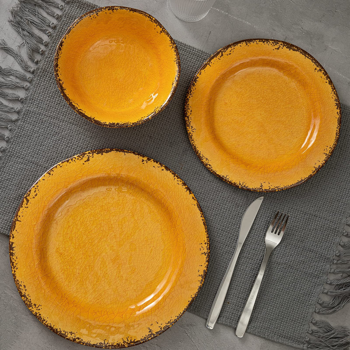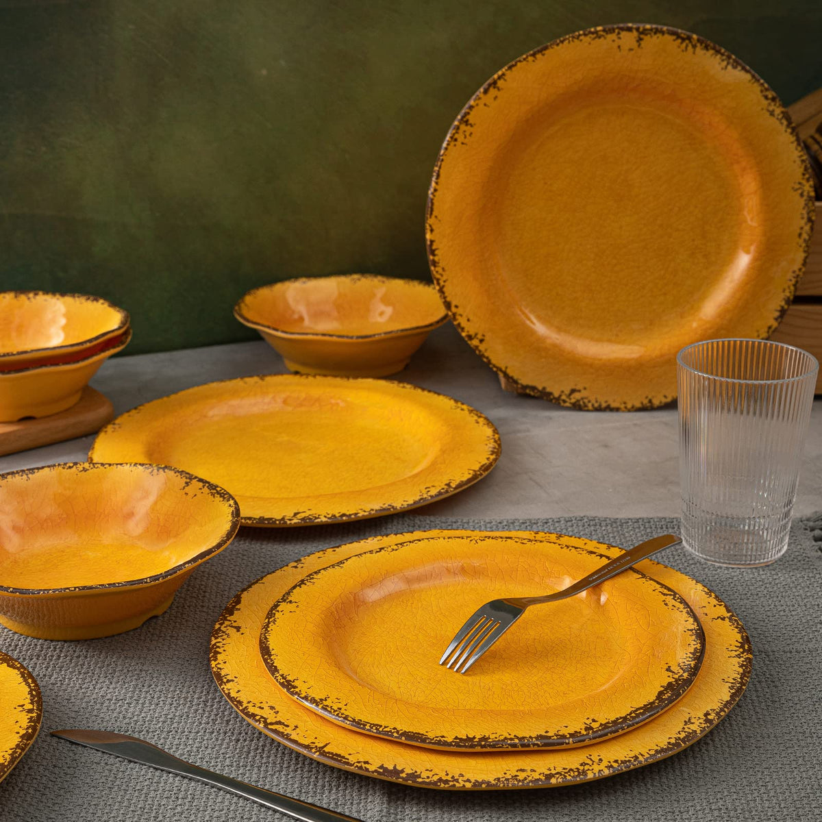 Perfect Size And Color: This Melamine Dinnerware Set Includes 4 Each Of The Following Item: 11Dia Dinner Plate, 9Dia Salad Plate, 7Dia X 2Ah Bowls, The Bright Gold Makes The Table Nobility, Luxury And Eye Catching Durable Material: These Yellow Crackle Dishes Are Made Of 100% Pure Melamine, Which Is Bpa Free, The Weight Is As Light As Plastic, But There Is No Odor, Looks Like Ceramic But Is Lighter, Chip-Resistant And More Sturdy Than Ceramics Outdoor Dishes Dinnerware: This Rustic Dishes Set Is Perfect For Outdoor Entertainment Lightweight Enough To Easily Take Them On Your Patio, Poolside, Picnics At The Beach Or Park, Also A Great Choice For Holiday Parties Or Weddings, Dont Worry About Damage Because They Are Unbreakable Use And Care Instruction: Easy To Clean, This Farmhouse Dinnerware Set Can Be Used In The Top Shelf Of Dishwashers, The Shine Stays After Several Cleaning, Makes Your Life More Convenient, Do Not Use For Microwave Or Oven Melamine Dinnerware Sets: Designed With Crackle Glazed Decor And Organic Rustic Rim Shape, The High-Quality Melamine Material Provides A Good Feel, Plates Deep Enough For Salad, Steak, Pizza, Pasta, Dessert, And Bowl Great For Soup, Cereal, Fruits And Snacks