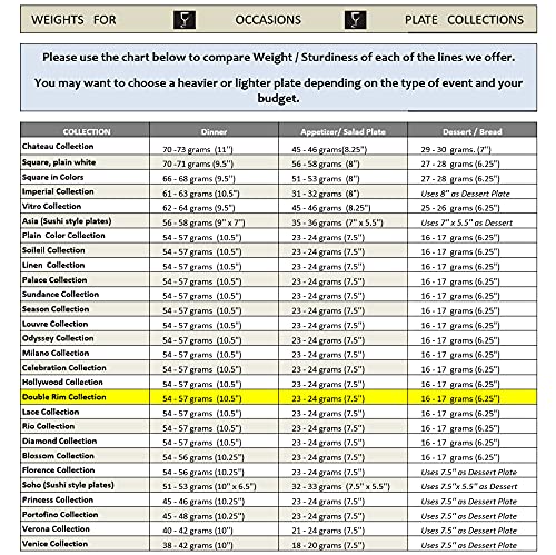 - Q: What are the dimensions of the plates in the OCCASIONS 50 Plates Pack? A: The OCCASIONS 50 Plates Pack includes 25 dinner plates that measure 10.5 inches and 25 appetizer/dessert plates that measure 7.5 inches.